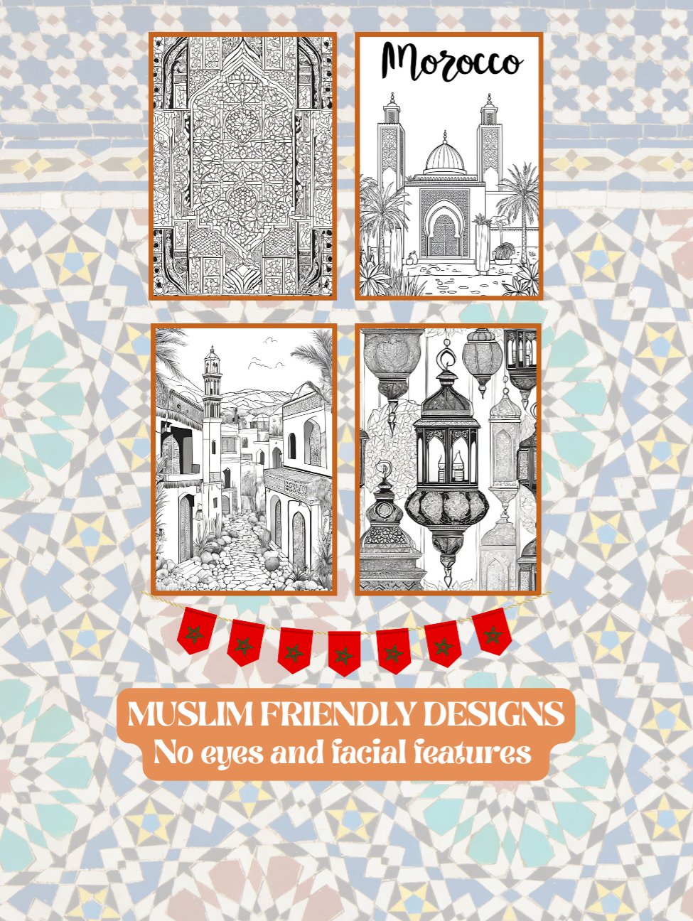 Immerse yourself in Morocco, featuring pages filled with intricate tile patterns, bustling medinas, stunning landscapes, and the allure of North African culture! Perfect for all ages, from kids to adults, these thoughtfully designed pages celebrate creativity and diversity while introducing you to the magic of Morocco.