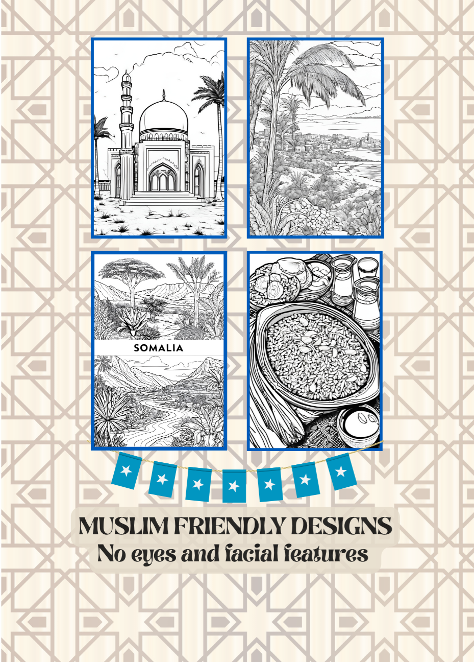 Immerse yourself in Somalia, featuring pages filled with breathtaking landscapes, traditional textiles, historic landmarks, and the essence of Somali culture! Perfect for all ages, from kids to adults, these thoughtfully designed pages are made to celebrate creativity and diversity while introducing you to the captivating beauty of Somalia.