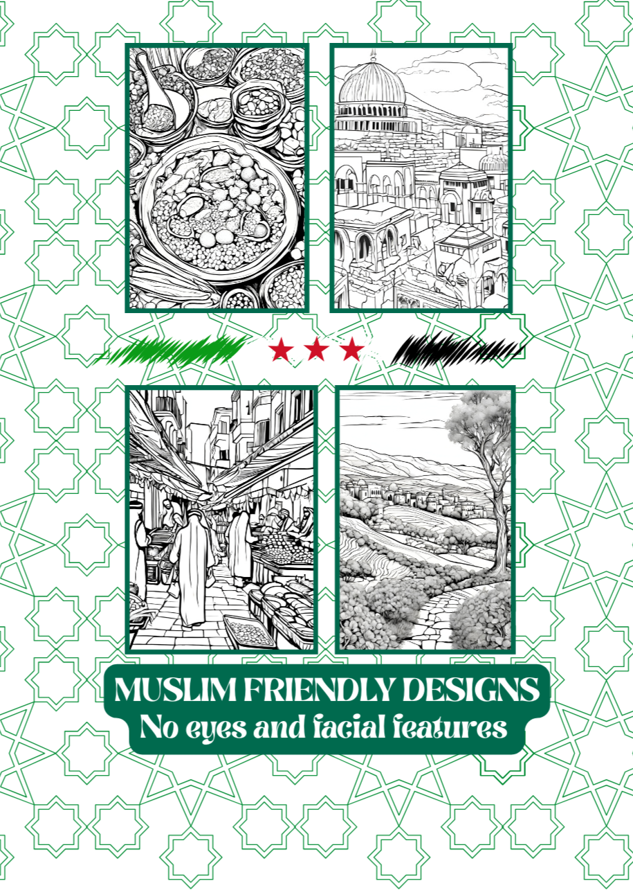 All designs contain no eyes or facial features, making them suitable for Muslims! The pictures range from intricate and detailed to simple and easy, ensuring there’s something for everyone to enjoy, no matter their skill level.