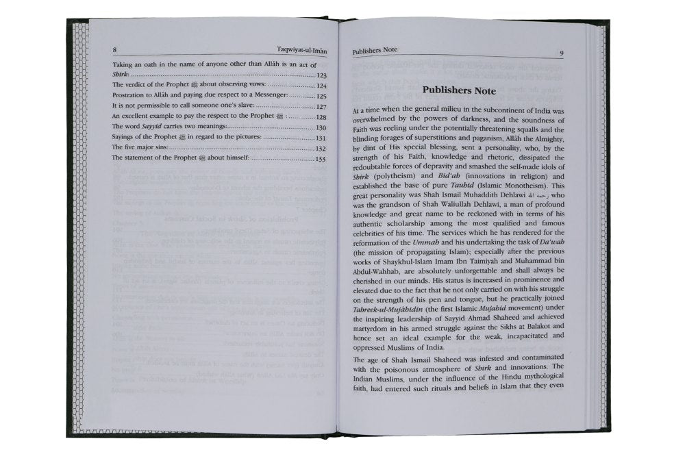 Taqwiyat-ul-Imaan is a great work of a great person, Shah Ismail Shaheed. He dedicated this book to the most important subject of Tawhid, a oneness of Allah S.W.T. It is a comprehensive work on Tawhid and explain all the types of shirk and also the implication of Tawhid in one’s life. It is one of the most comprehensive works on Tawhid. Tauheed is the basic and first pillar of Islam. If a person goes in doubt in tauheed he cannot rank him up by doing all other deeds. The book is designed to understand tauheed and the thins which make disturbance in the strong faith of a Muslim.