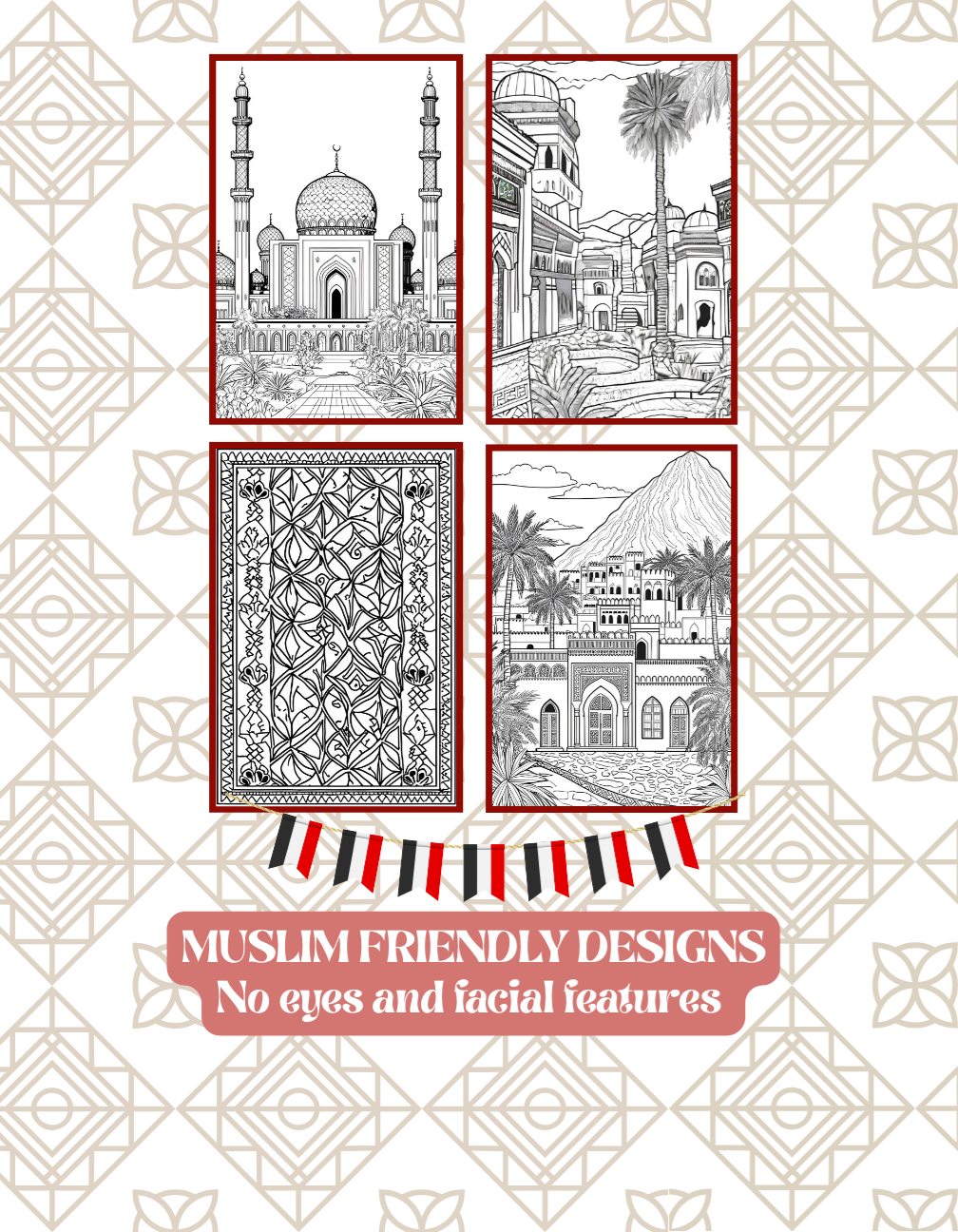 All designs contain no eyes or facial features, making them suitable for Muslims! The pictures range from intricate and detailed to simple and easy, ensuring there’s something for everyone to enjoy, no matter their skill level.