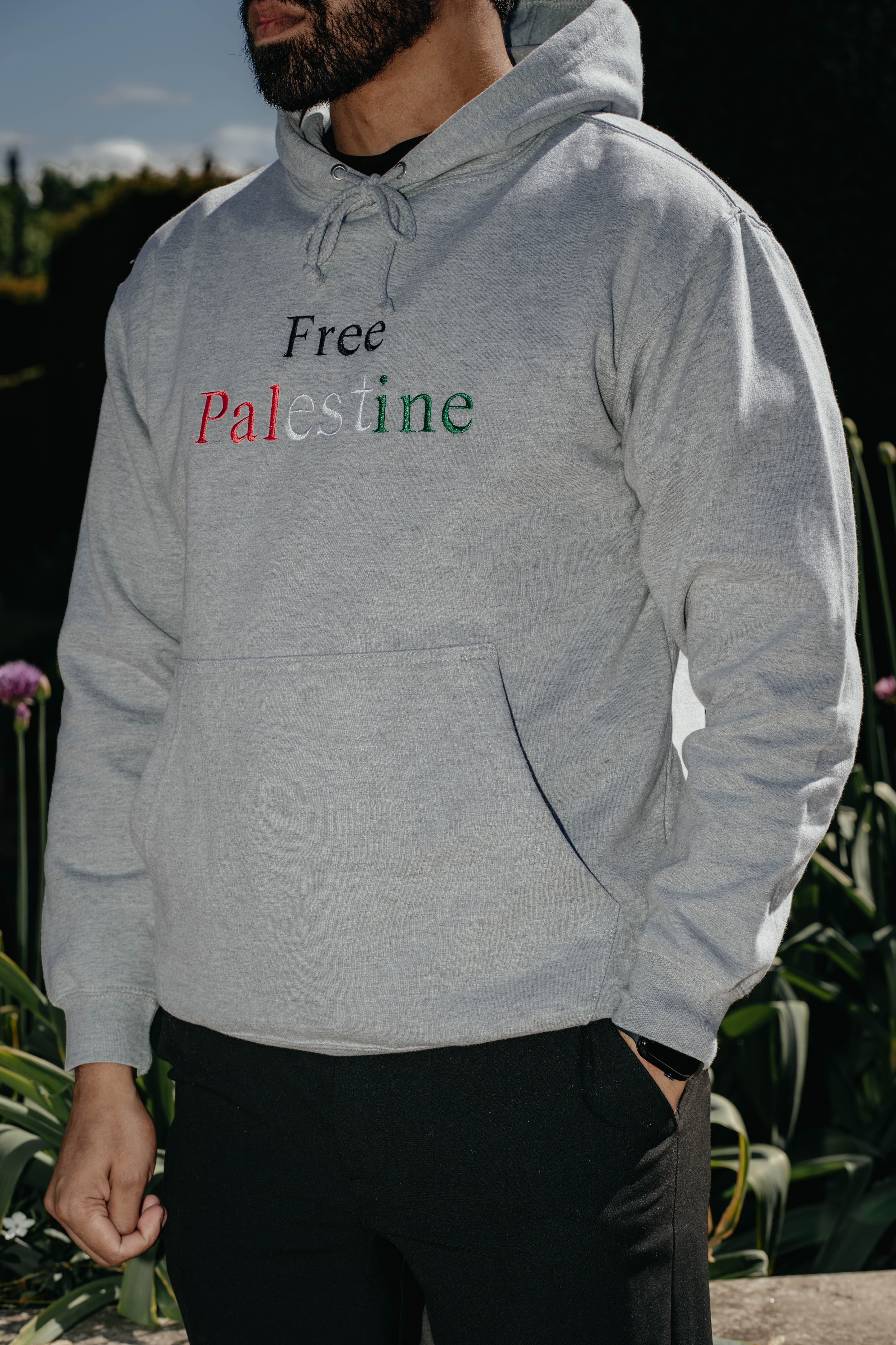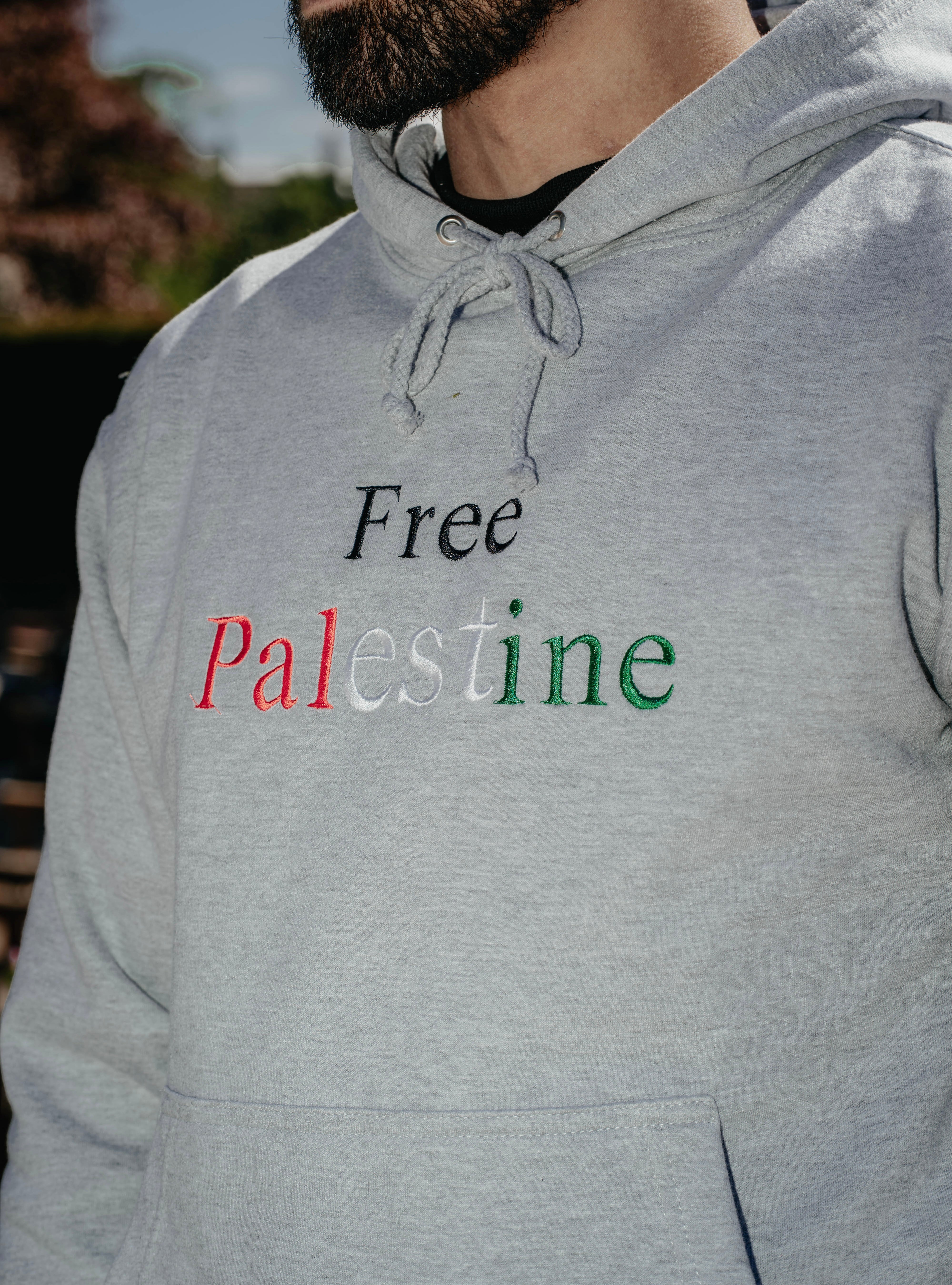 Embroidered with high quality threads in the colours of the Palestinian flag: green, white, red, and black, this hoodie transforms a powerful message into a wearable act of resistance and unity.