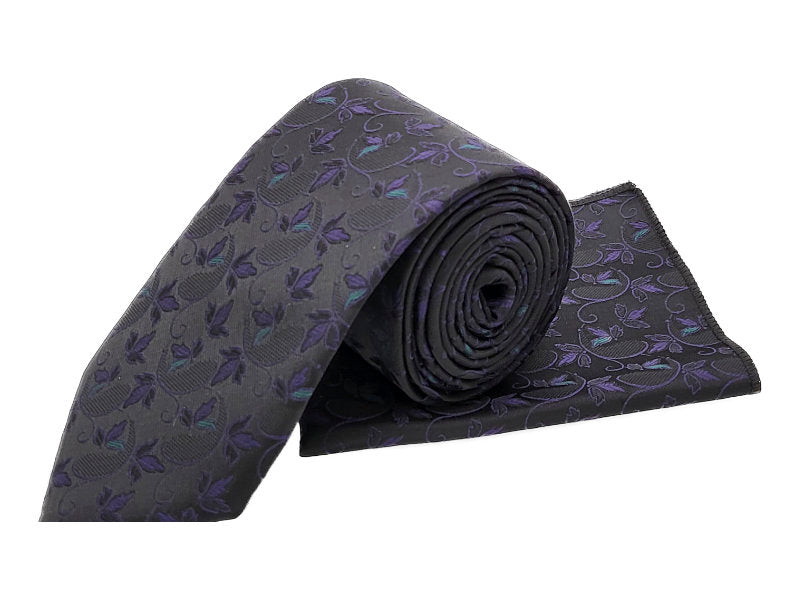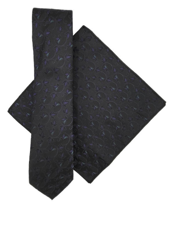 A floral suit accessory set by SI. This black and purple-toned tie with a matching pocket square will add sophistication to your formal attire perfect for any occasion and season. Also available in other colours.