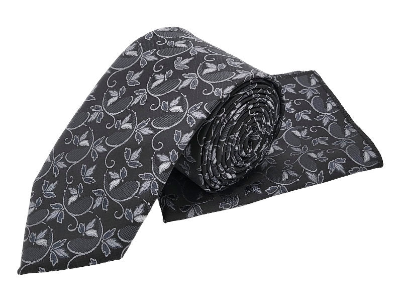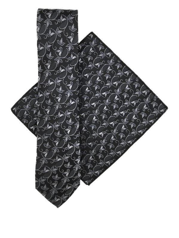 A floral suit accessory set by SI. This black and silver-toned tie with a matching pocket square will add sophistication to your formal attire perfect for any occasion and season. Also available in other colours.