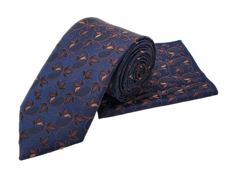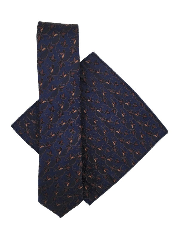 A floral suit accessory set by SI. This navy and brown-toned tie with a matching pocket square will add sophistication to your formal attire perfect for any occasion and season. Also available in other colours.