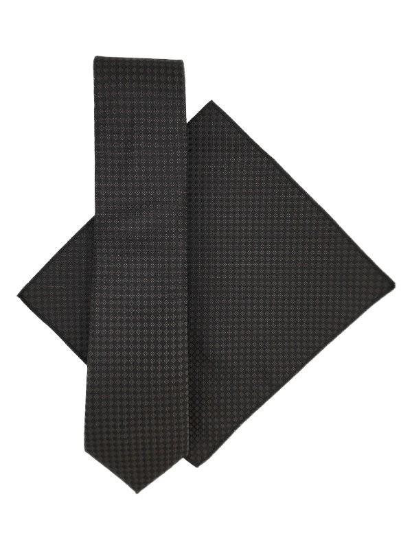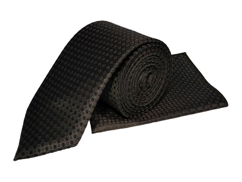 A geometric suit accessory set by SI. This black and white-toned tie with a matching pocket square will add elegance to your formal attire perfect for any occasion and season. Also available in other colours.