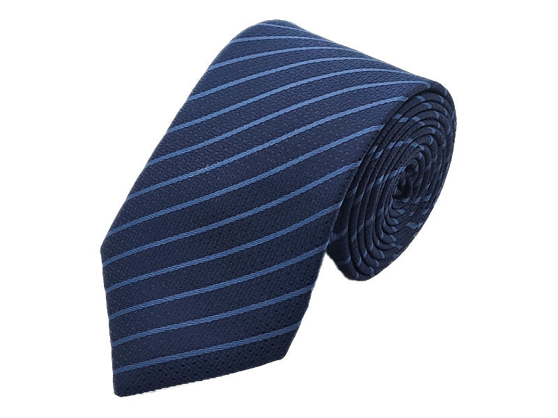 A classic design by SI. This navy textured background with sky blue stripes will add elegance and personality to your formal attire. Also available in other colours.