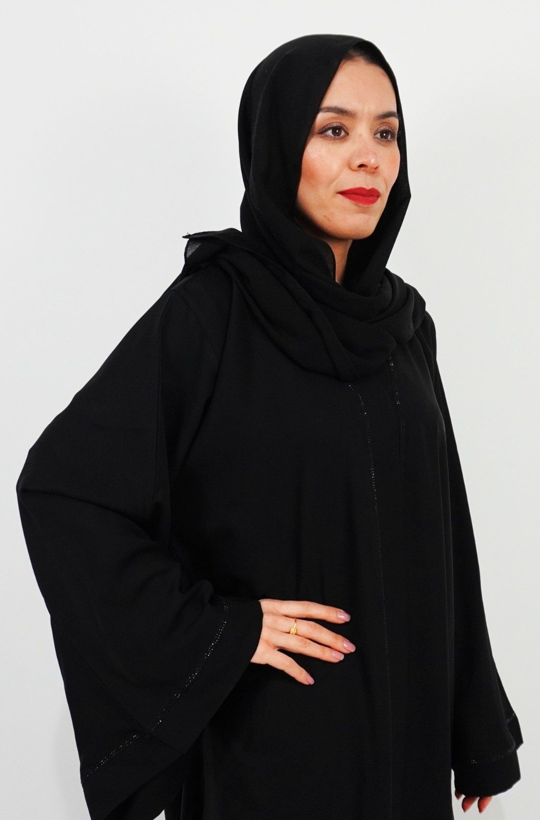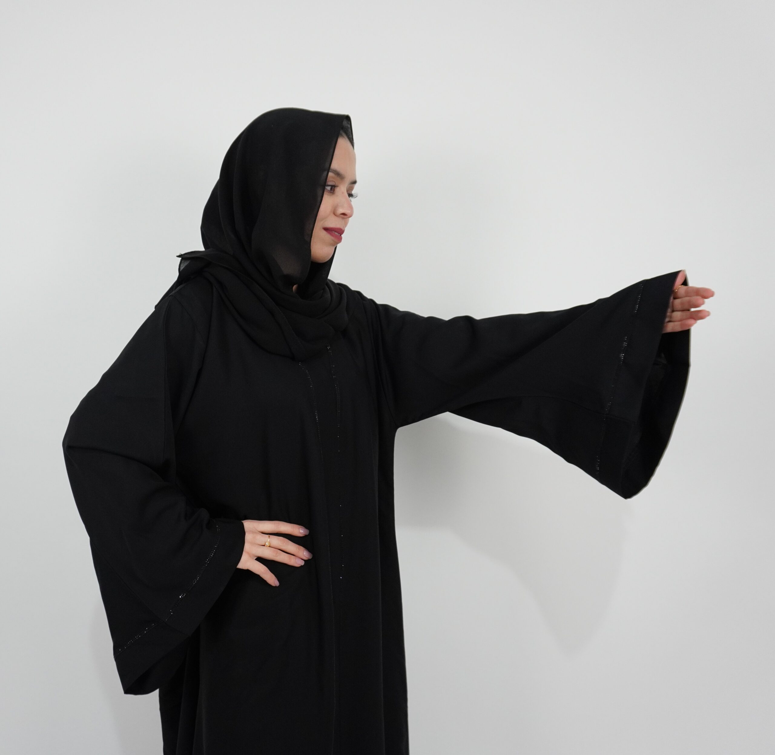 Exude grace and sophistication with this Black Nida Abaya, crafted with delicate DMC stonework along the sleeves and neckline for a subtle yet elegant sparkle. Made from premium Nida fabric, it drapes beautifully while ensuring comfort and breathability.