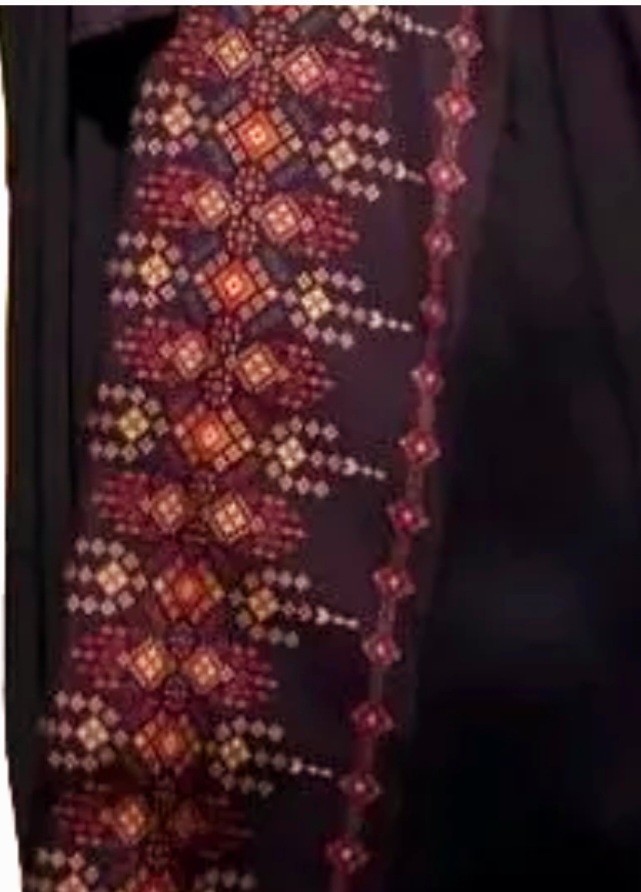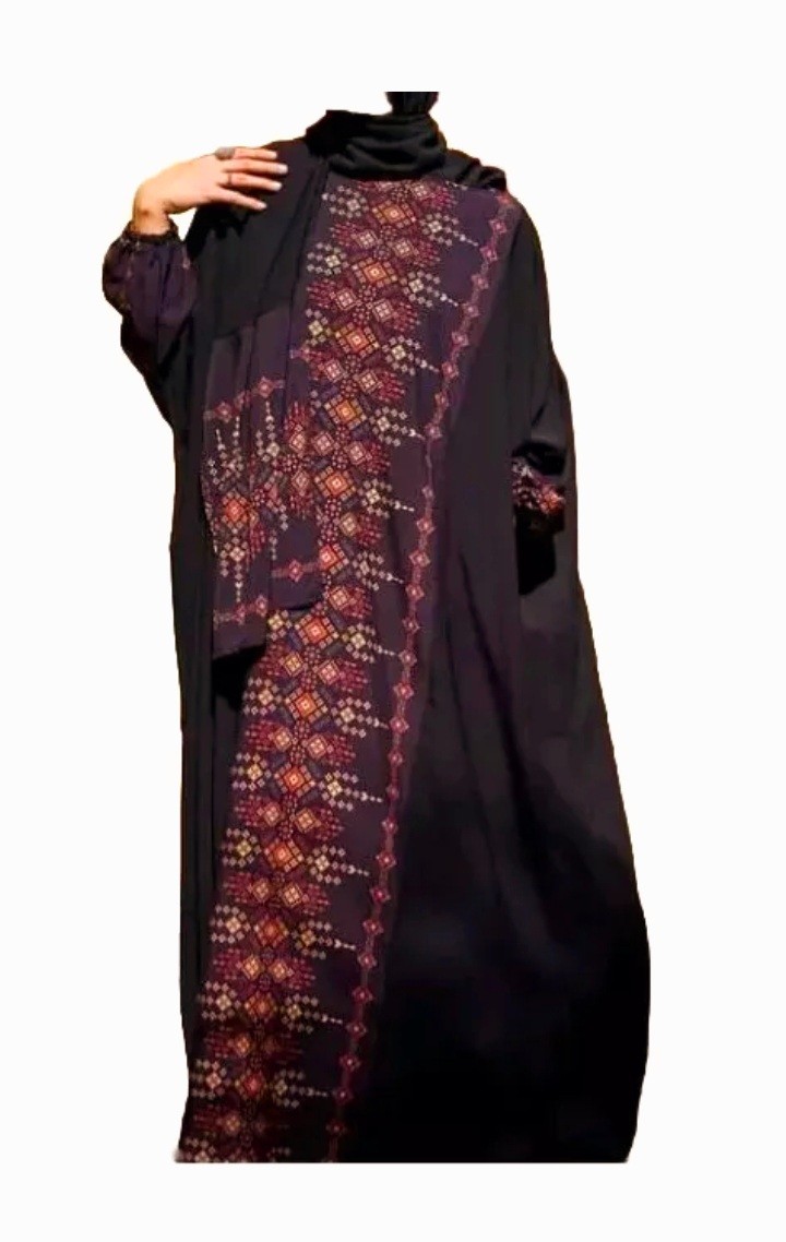 Introducing Tatreez Pattern abaya/prayer dress is a black kaftan style with scarf attached. It features tatreez print on both dress and attached scarf part.