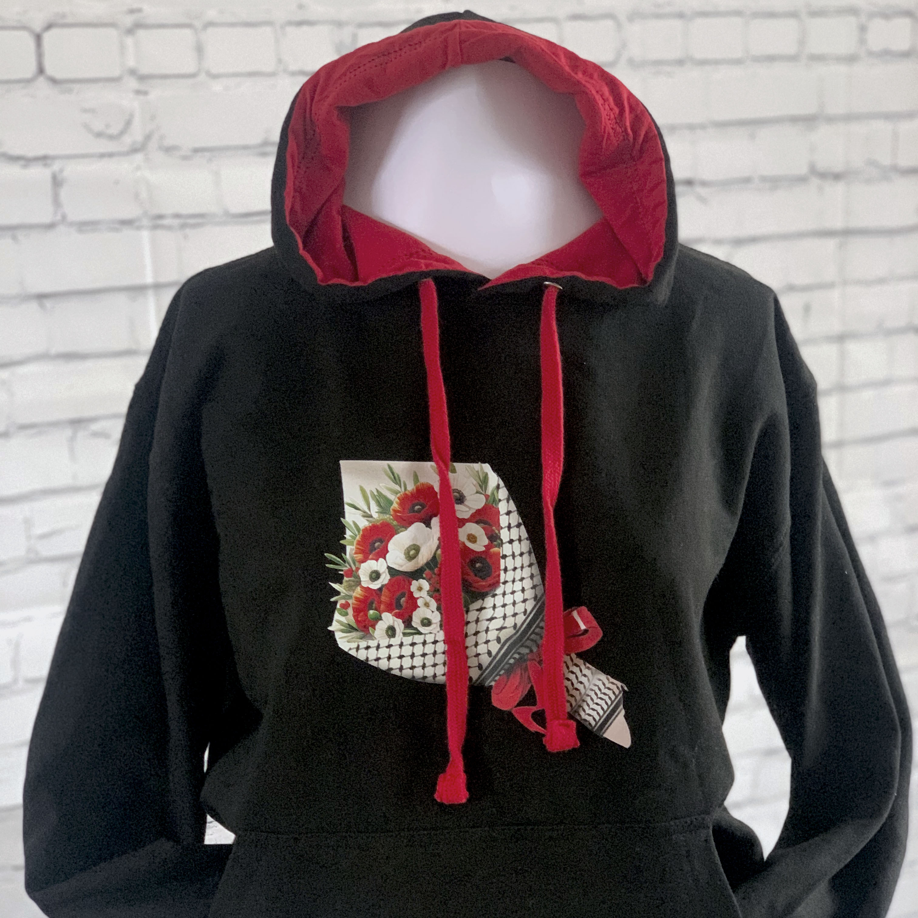 Introducing our exclusive Olives & Poppies Hoodie. This beautiful black hoodie, has a striking red-lined hood and matching ties and is an embodiment of art, culture, and solidarity.