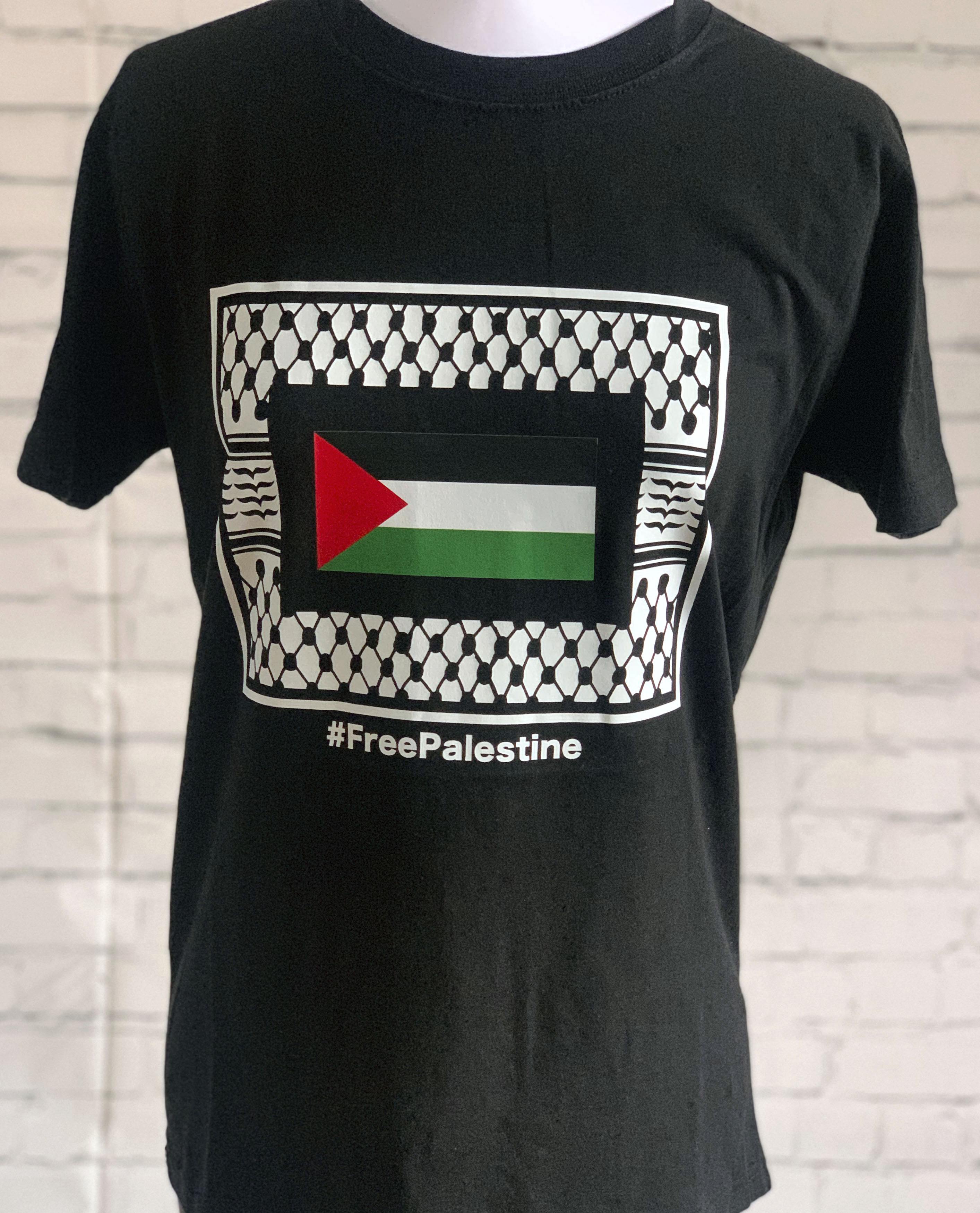 Black Unisex T-shirt with Keffiyeh frame and Palestine Flag.