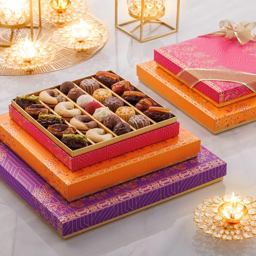 This delicious gifting box from world renowned dates purveyors Bateel, includes a selection of their finest dates and handmade (egg free biscuits) presented in a stunning pink and gold brocade box.