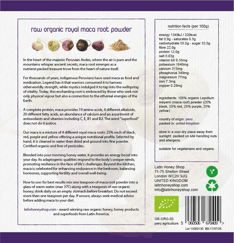 Our maca is a mixture of 4 different royal maca roots: 25% each of black, red, purple, and yellow offering a unique nutritional prole. Selected by hand, it is cleaned in water then dried and ground into new powder.