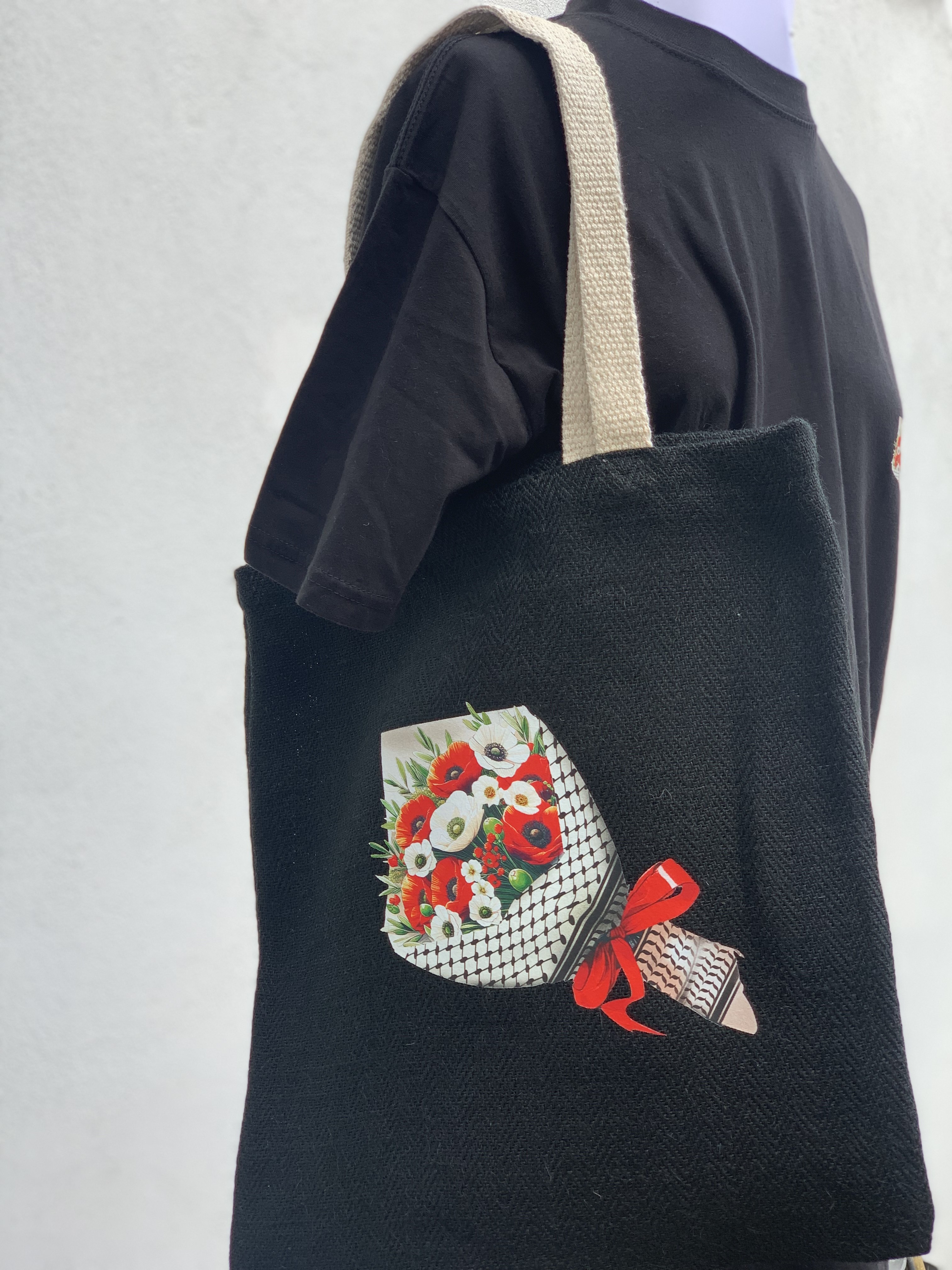 The focal point of this unique tote bag is a captivating image featuring a delicate arrangement of poppies and olives wrapped in paper, adorned with a keffiyeh-inspired design. The rich symbolism of poppies and olives, coupled with the keffiyeh pattern, creates a visual narrative advocating for peace in solidarity with the people of Palestine.