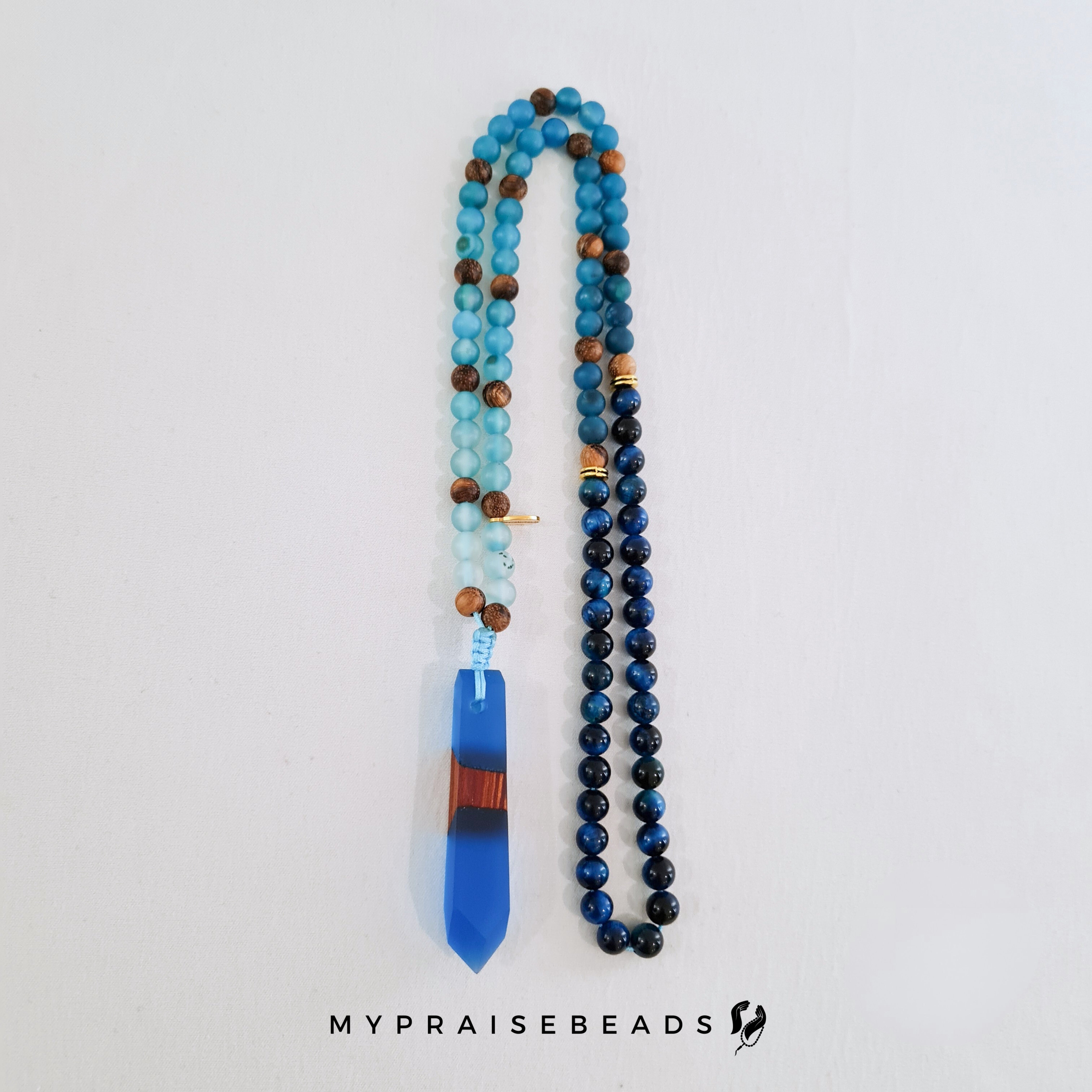 A turquoise unisex tasbih, made from agate, tiger eye and wood. This piece is very light due to the resin pendant, making it perfect for transport.