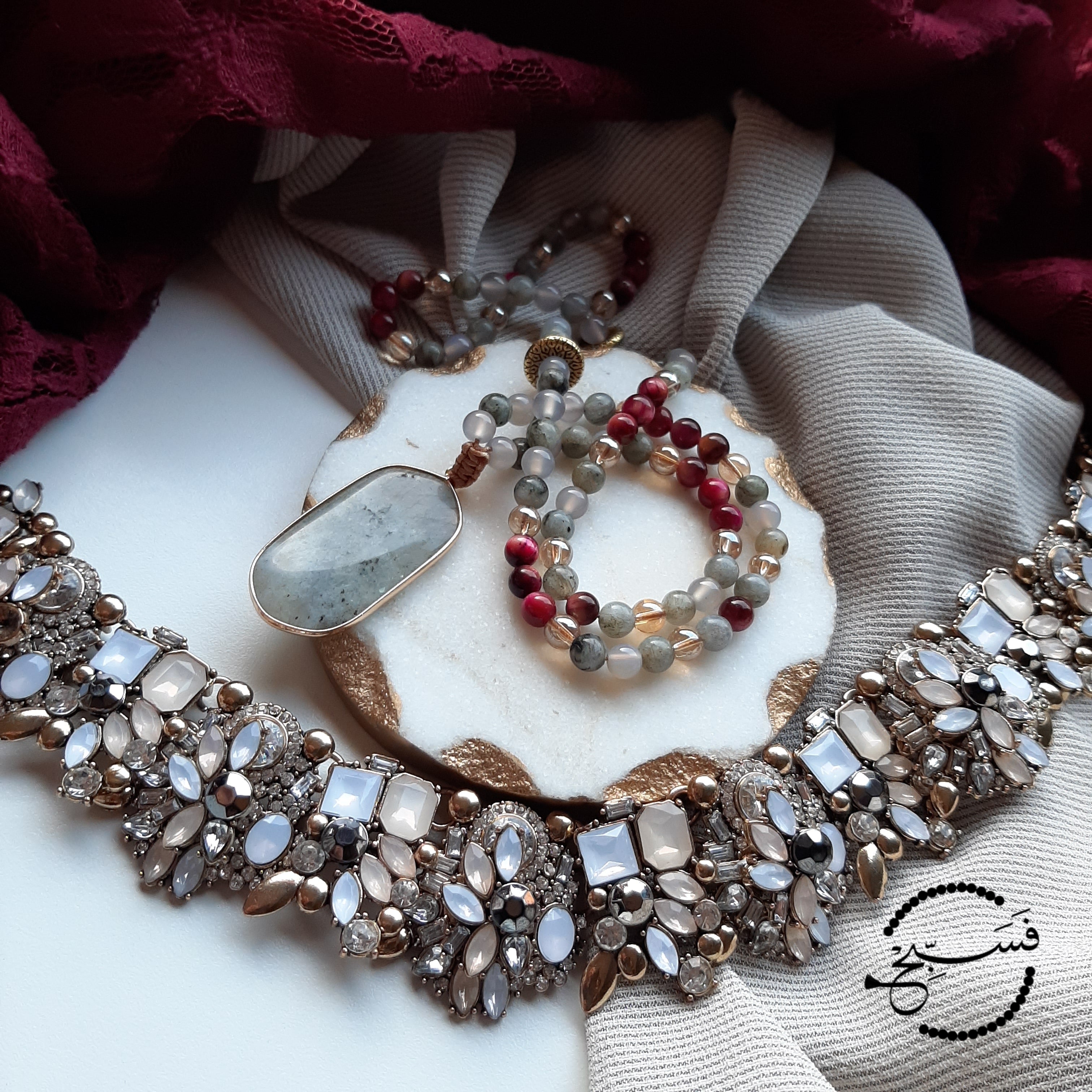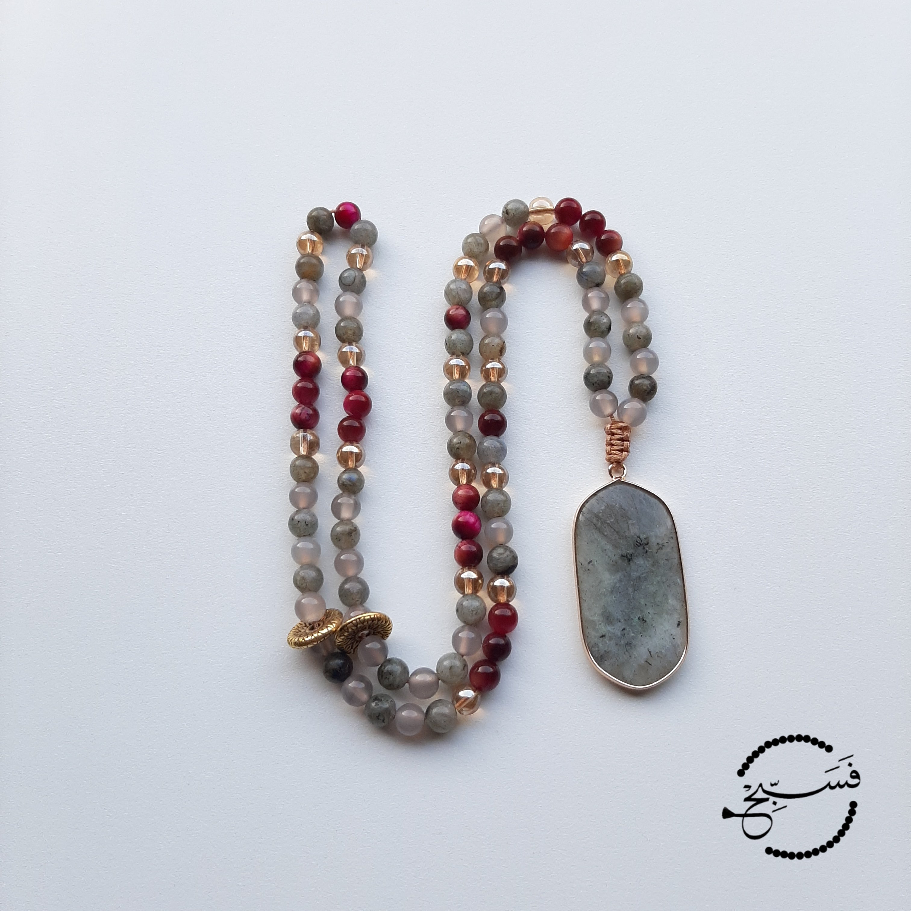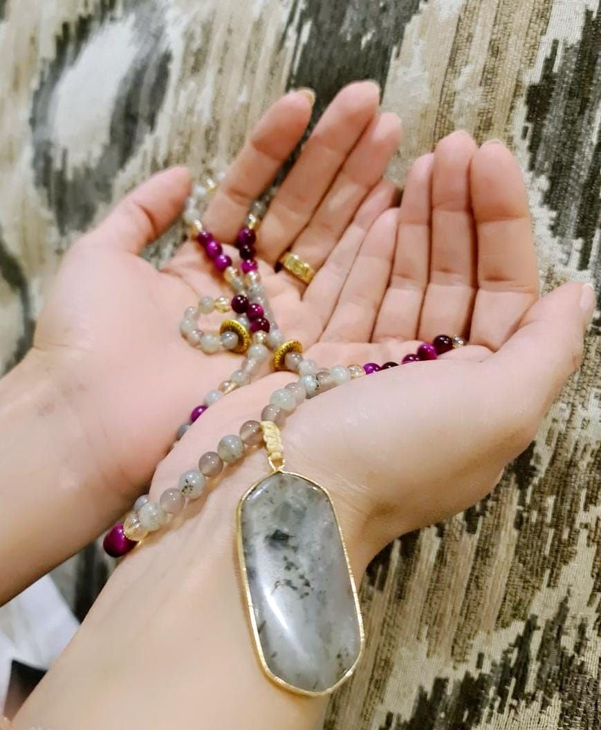 One of our bestselling designs, this tasbih uses a combination of spectrolite, grey agate and fuchsia tiger eye beads. The pendant is labradorite.