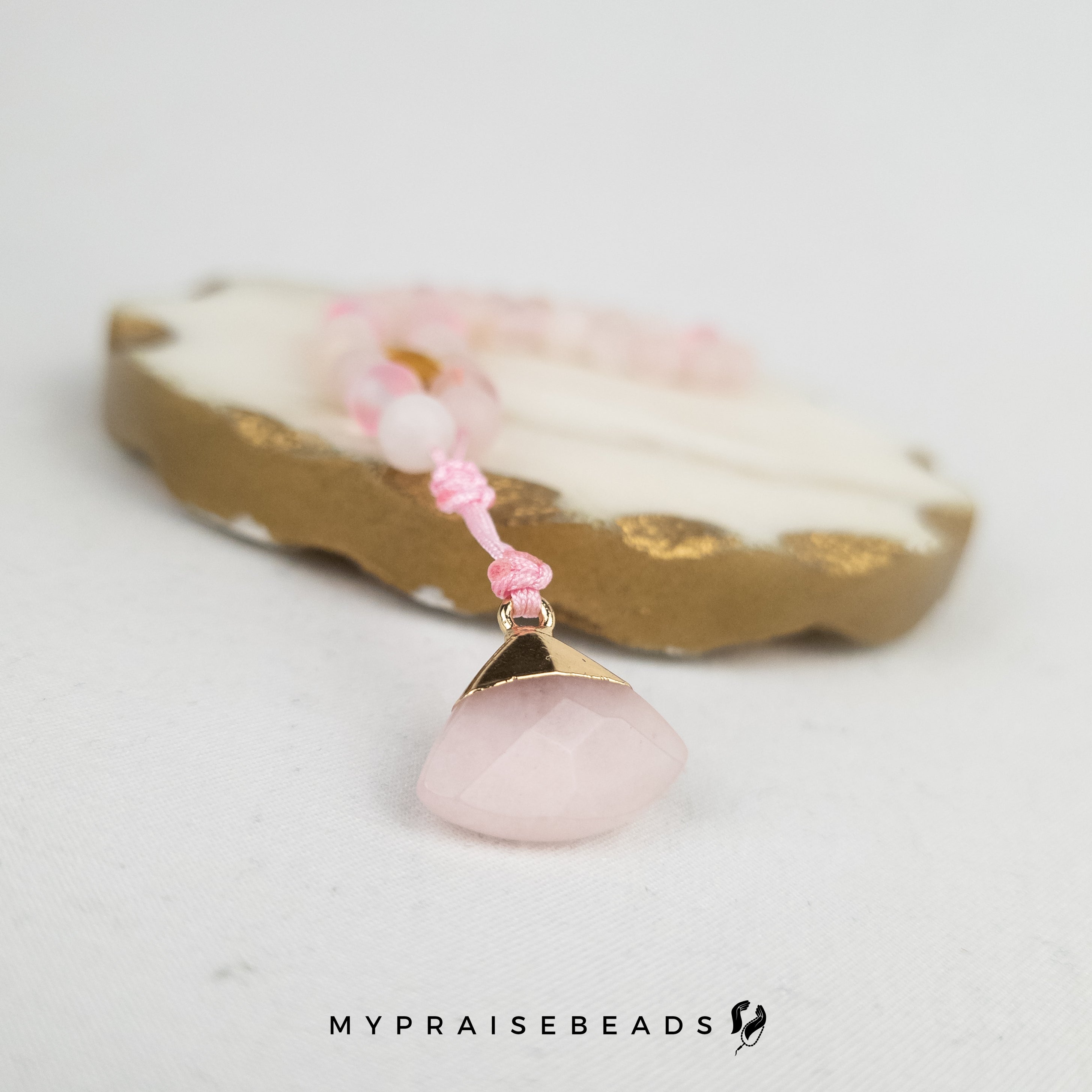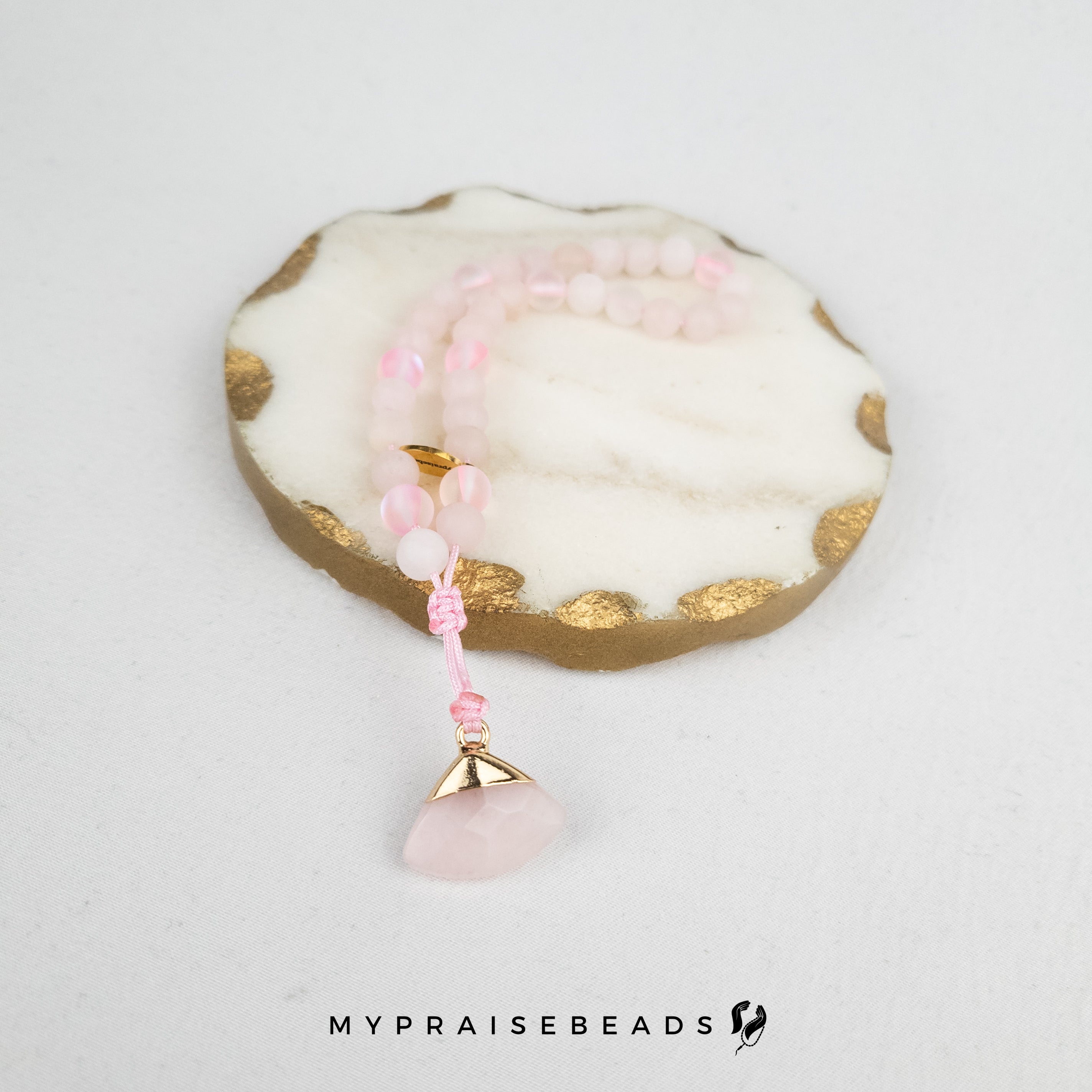 Rose quartz and moonstone beads, with a rose quartz pendant.