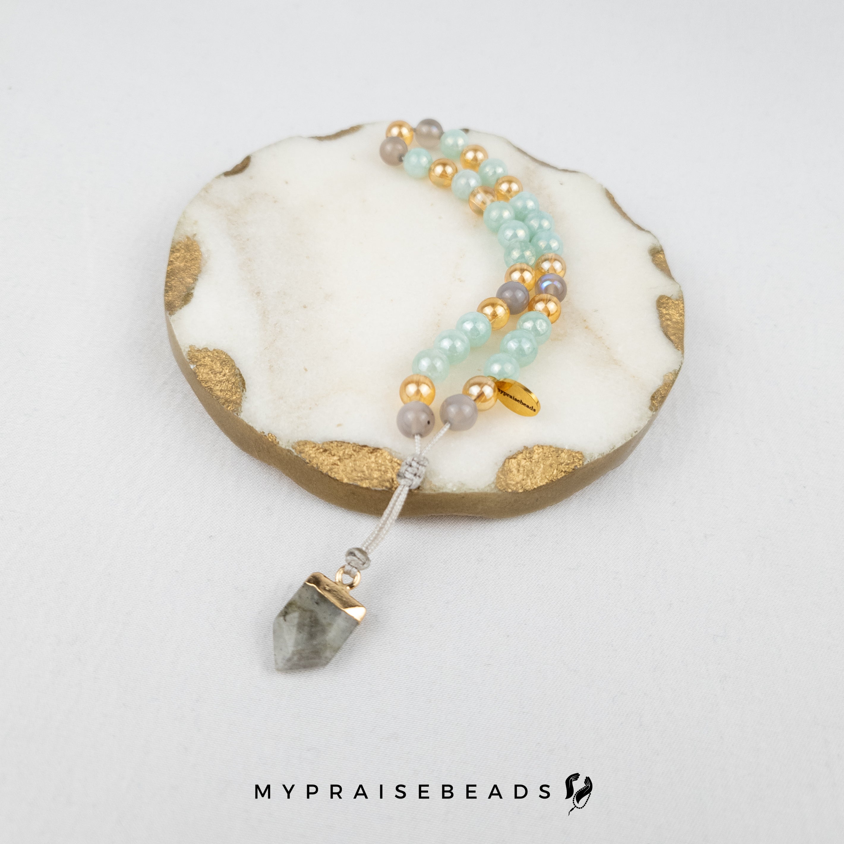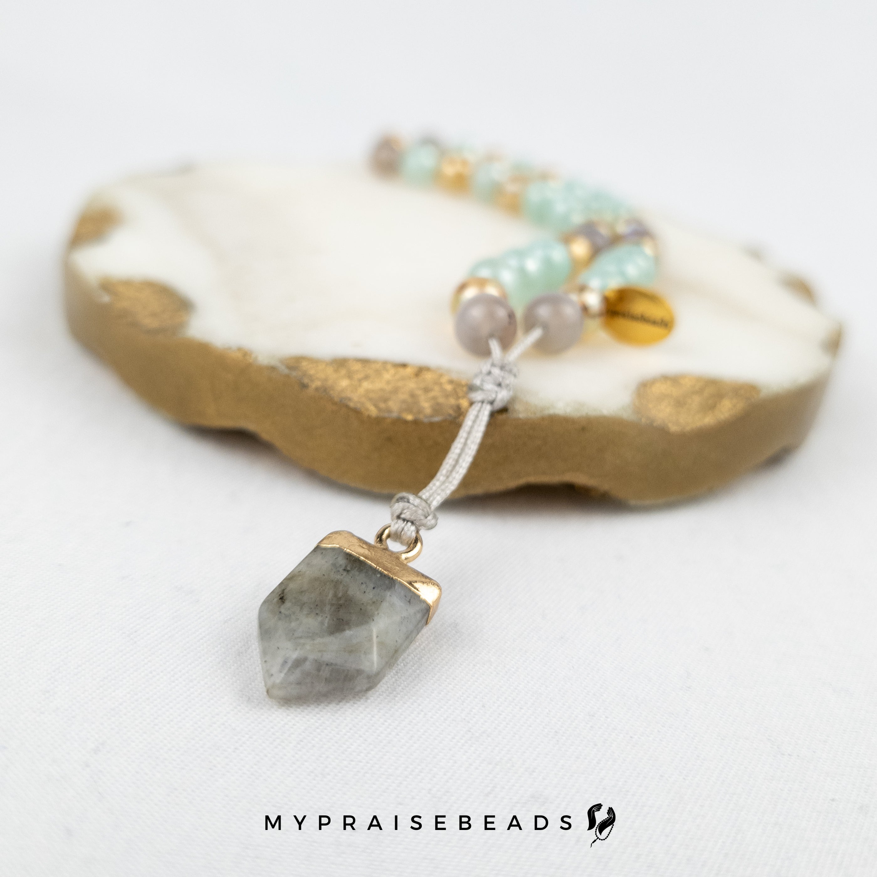 A striking contrast of turquoise and grey spectrolite beads, finished with a small, delicate labradorite pendant. The spectrolite beads offer a subtle shimmer with their grey and blue undertones.