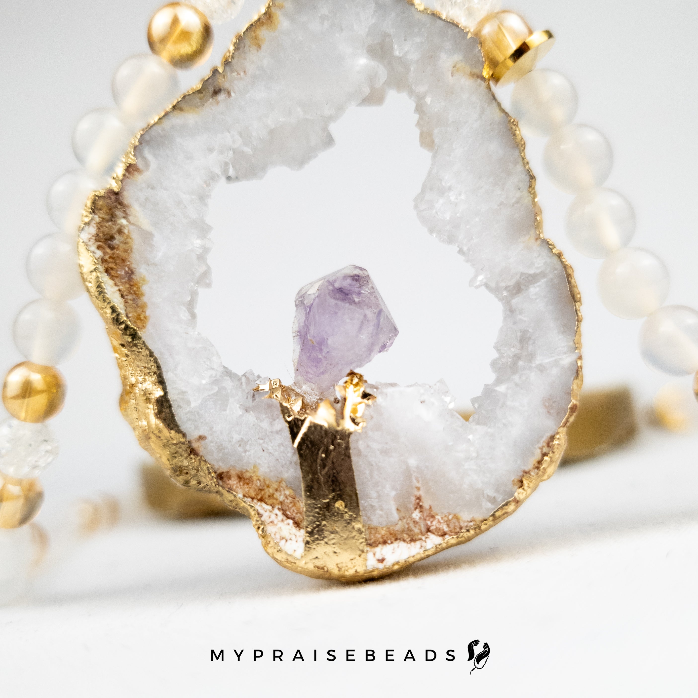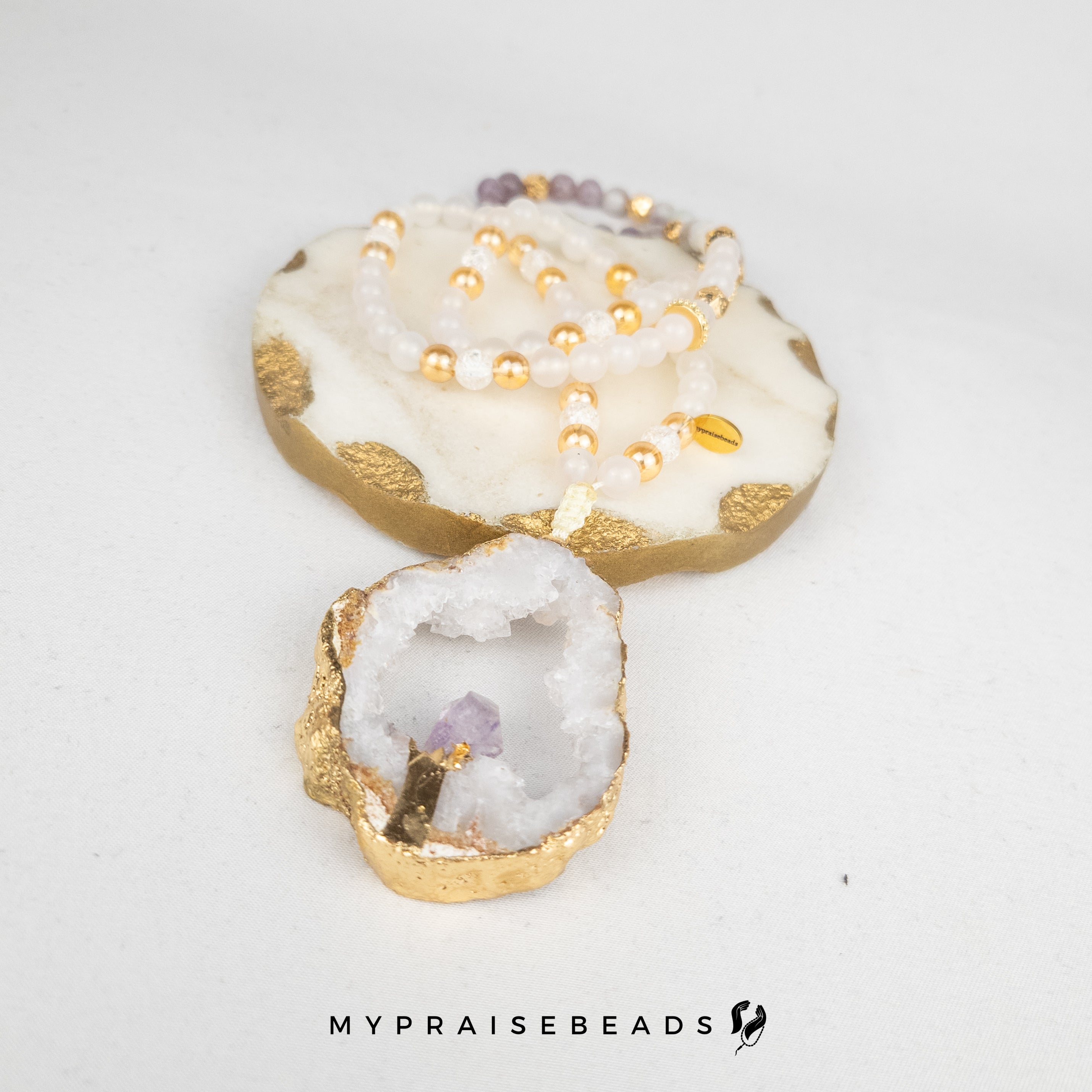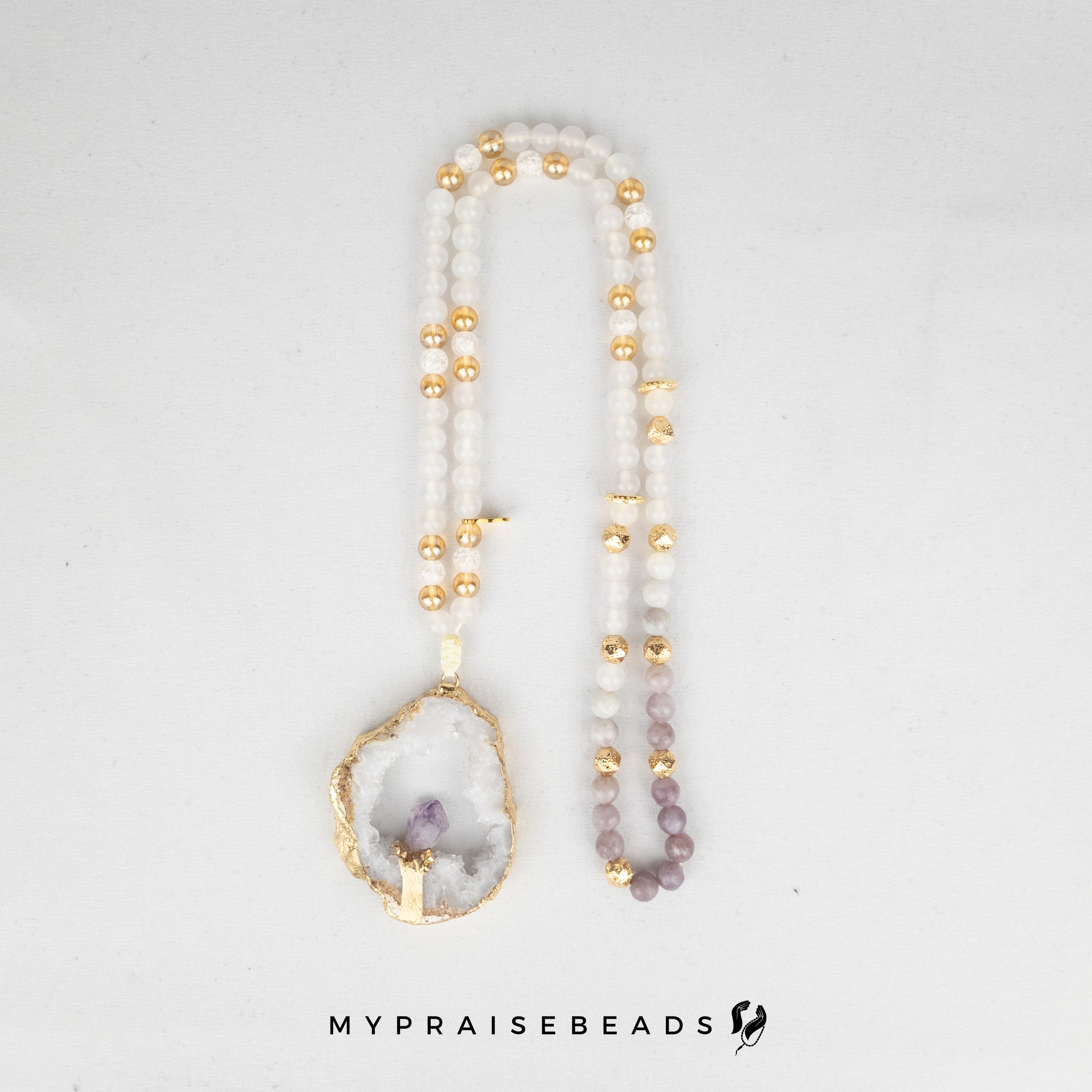 A beautiful ombre of white agate to lilac jasper with a unique pendant. Please note that pendant size and shape may vary due to the nature of the stone.