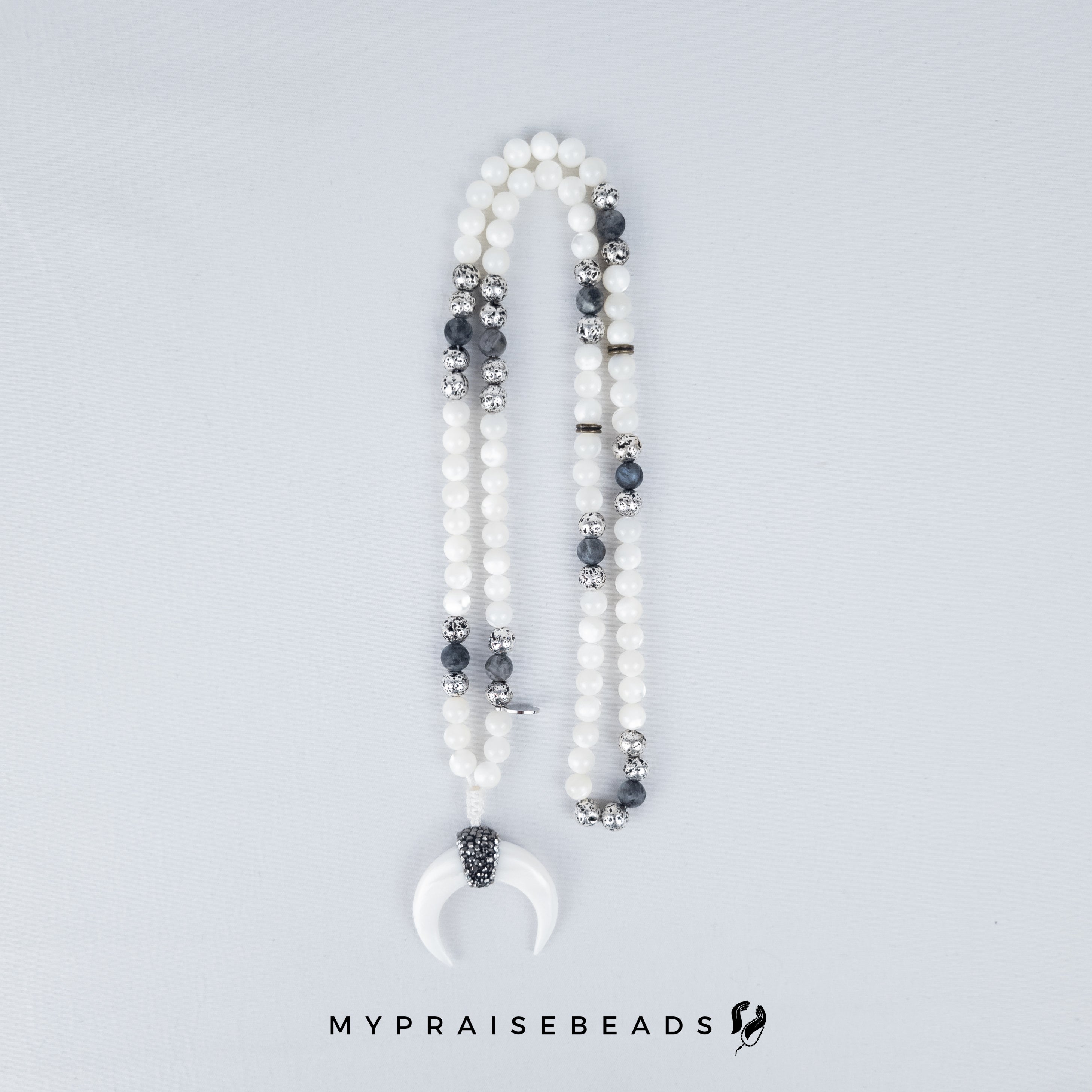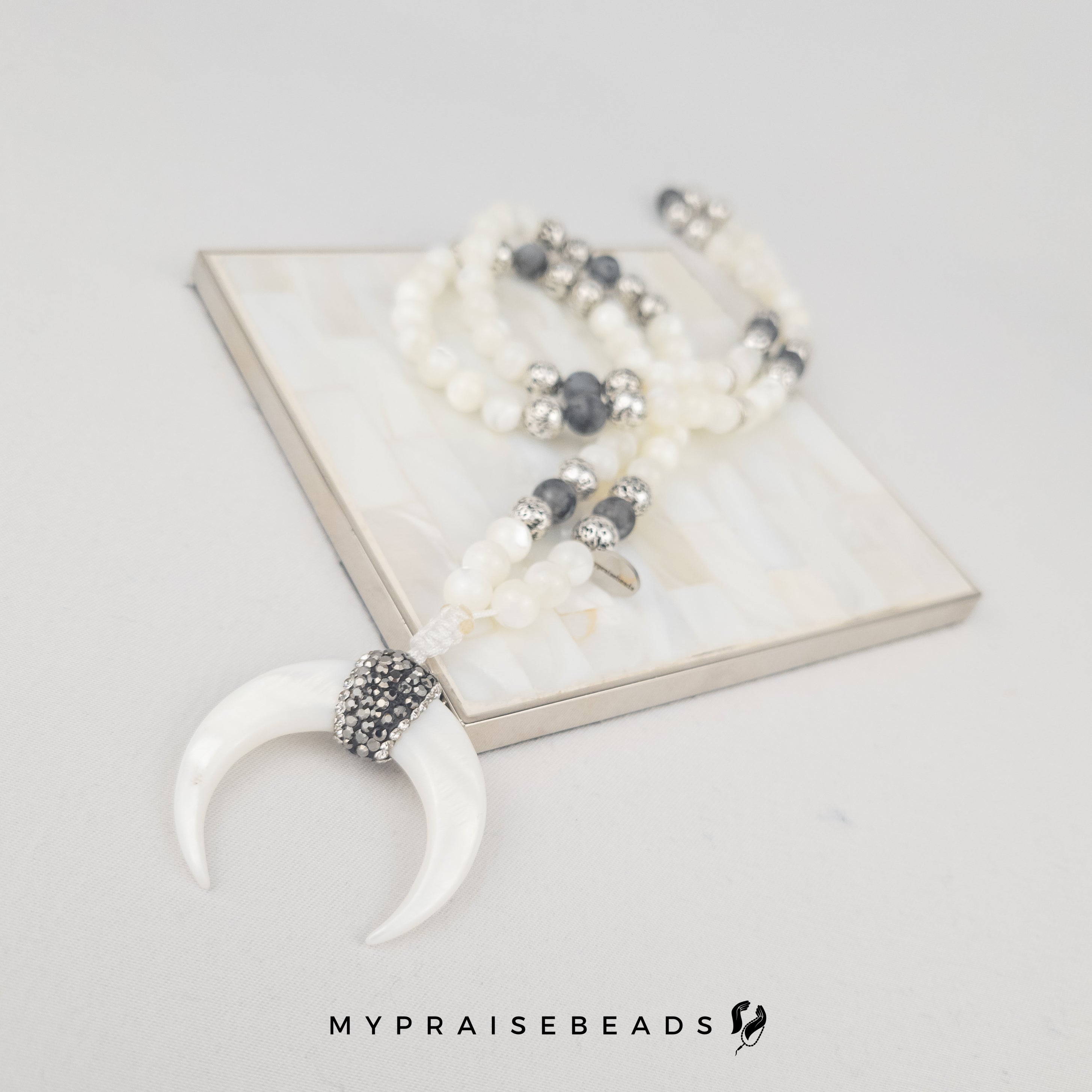 White trochus shell paired with black labradorite and a stunning moon pendant.