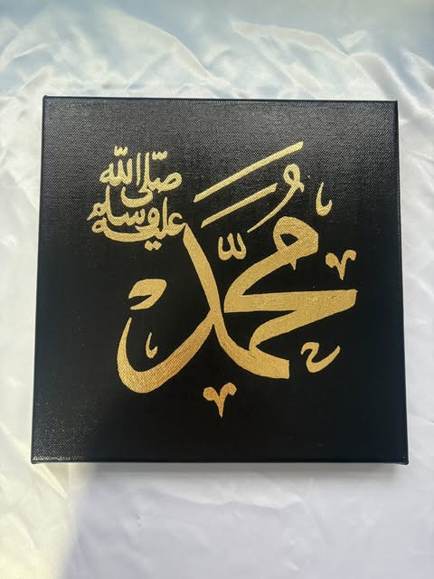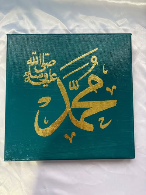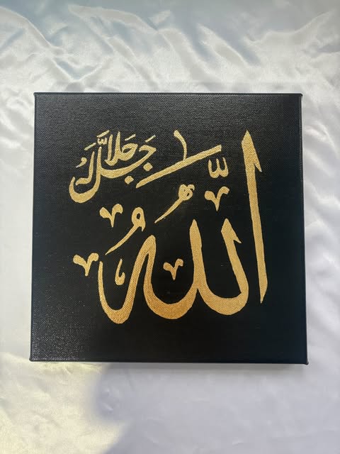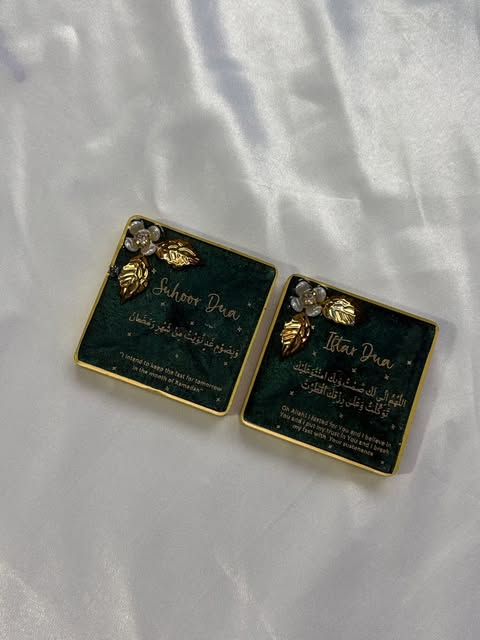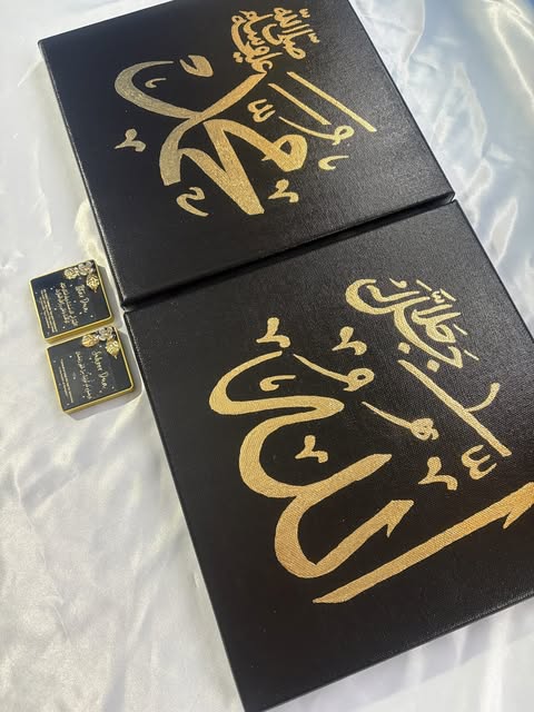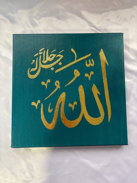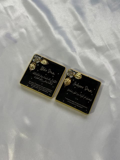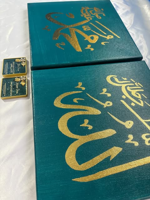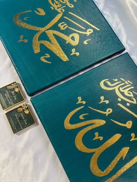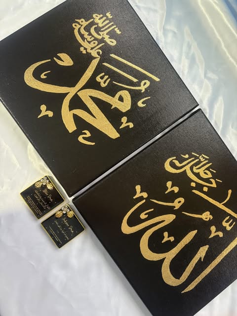 Each gift set consists of 2 handmade canvases (10x10 inches each) quotes ALLAH and MUHAMMAD in Arabic with gold leaves, and two resin fridge magnets with Iftaar and Suhoor Duas