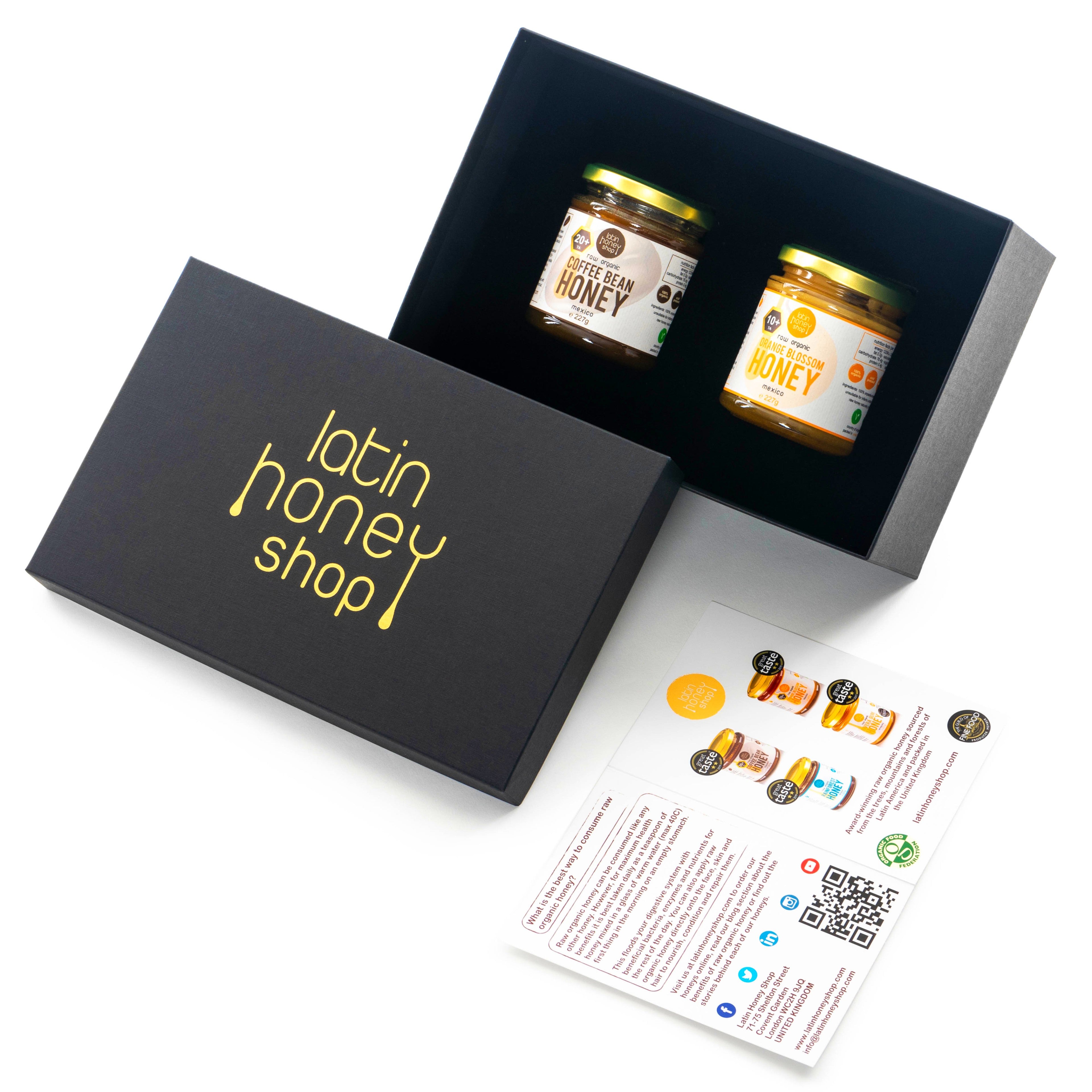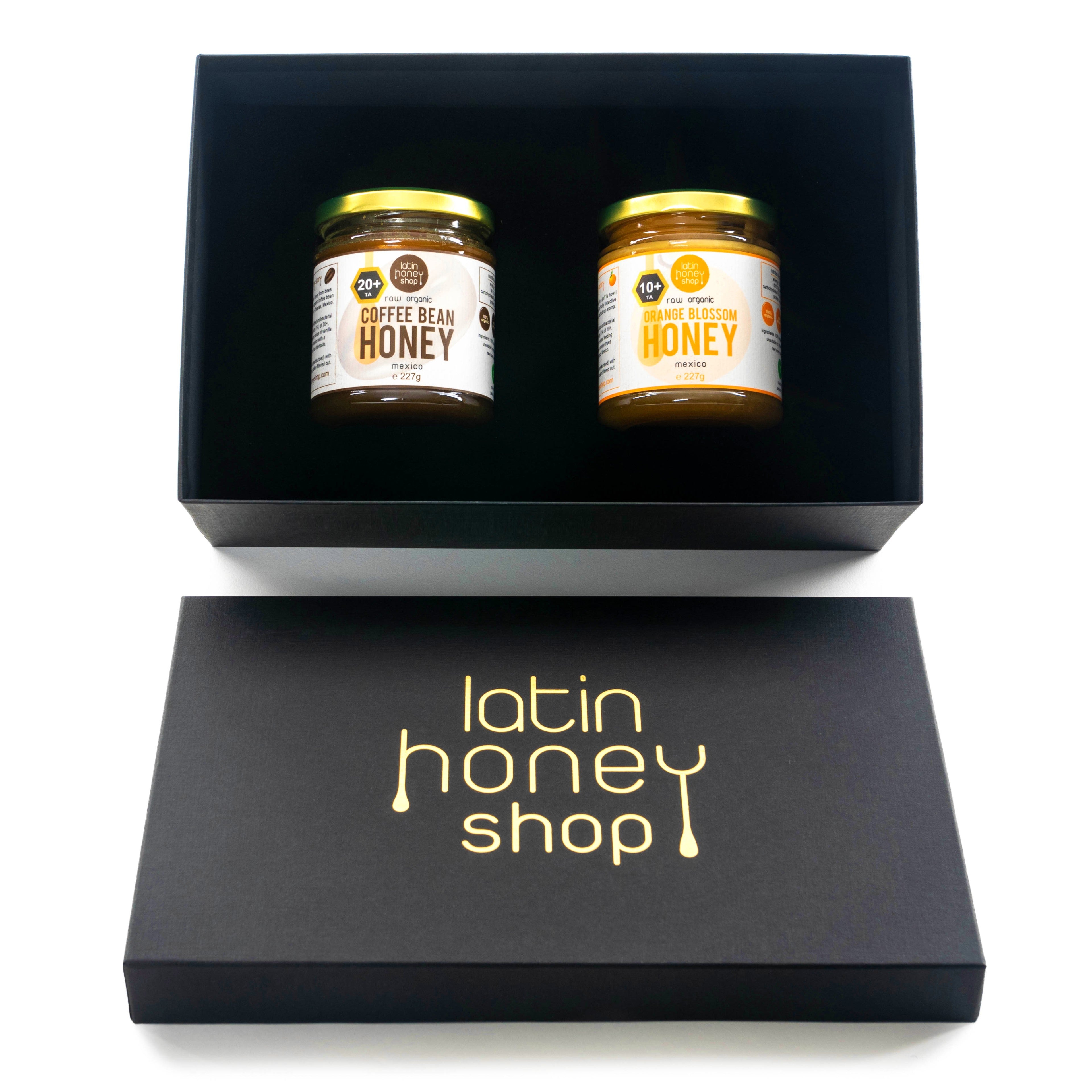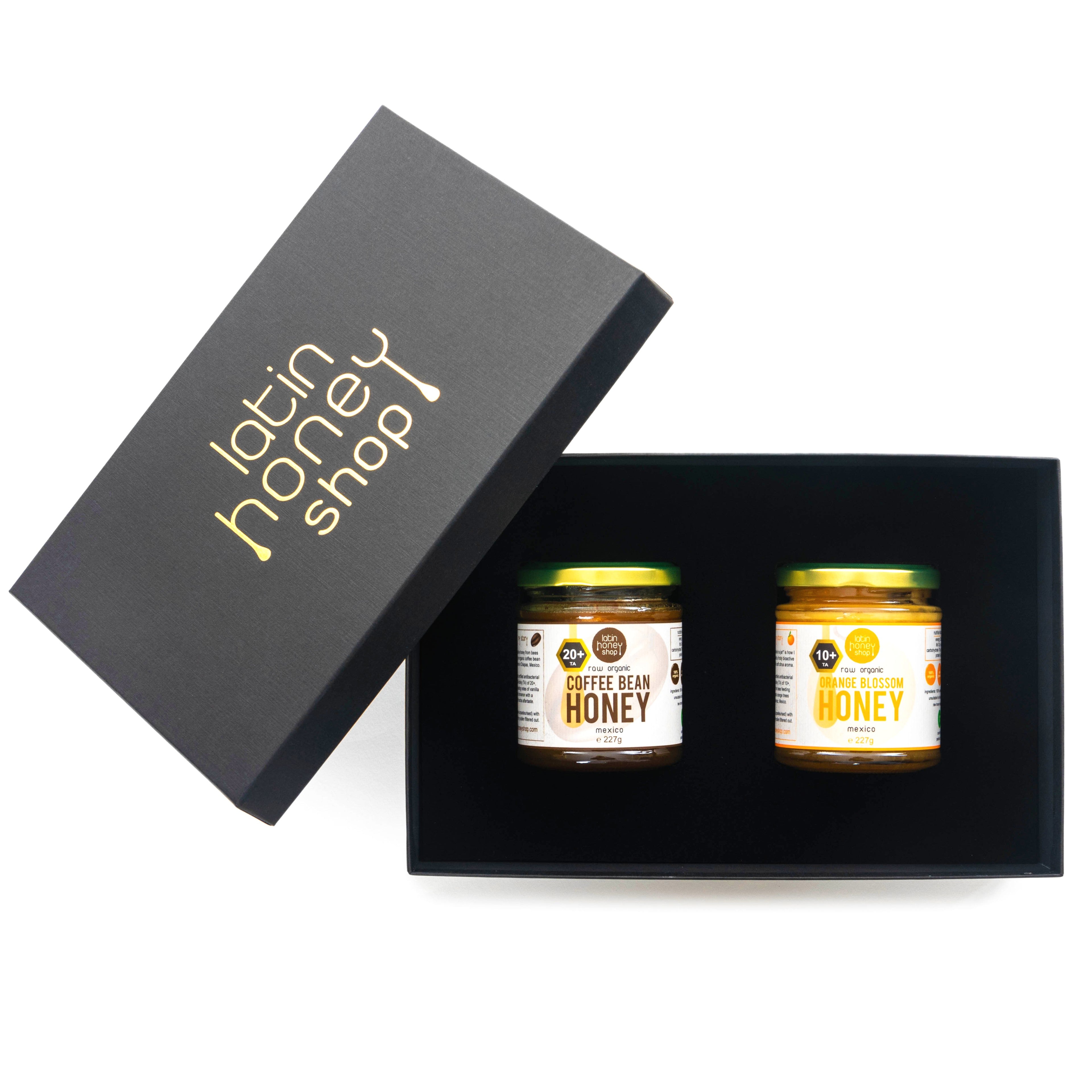 It contains two jars of some of the world's rarest organic antibiotic honeys both enclosed in a gold embossed luxury gift box with velvet foam that we had custom made in Germany.