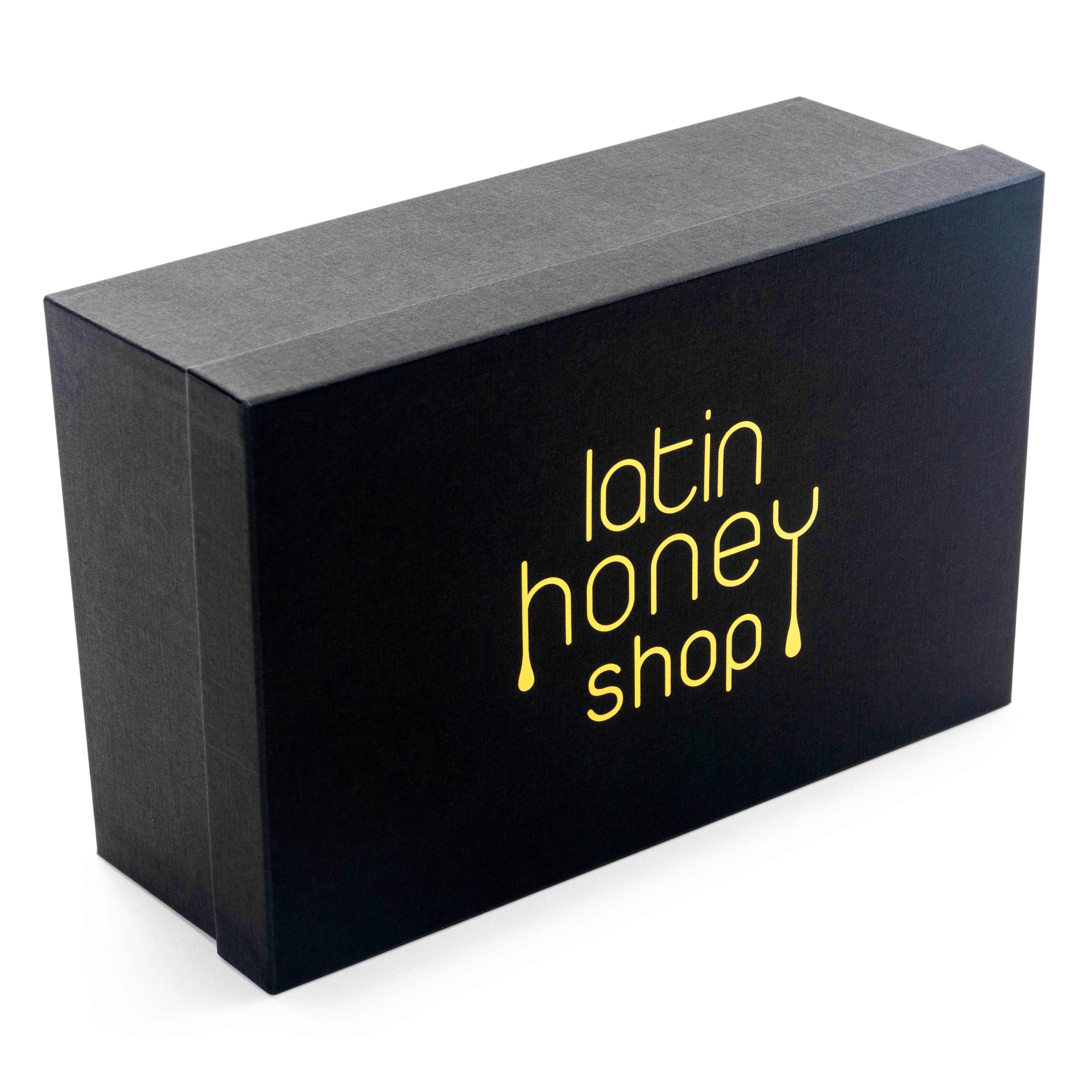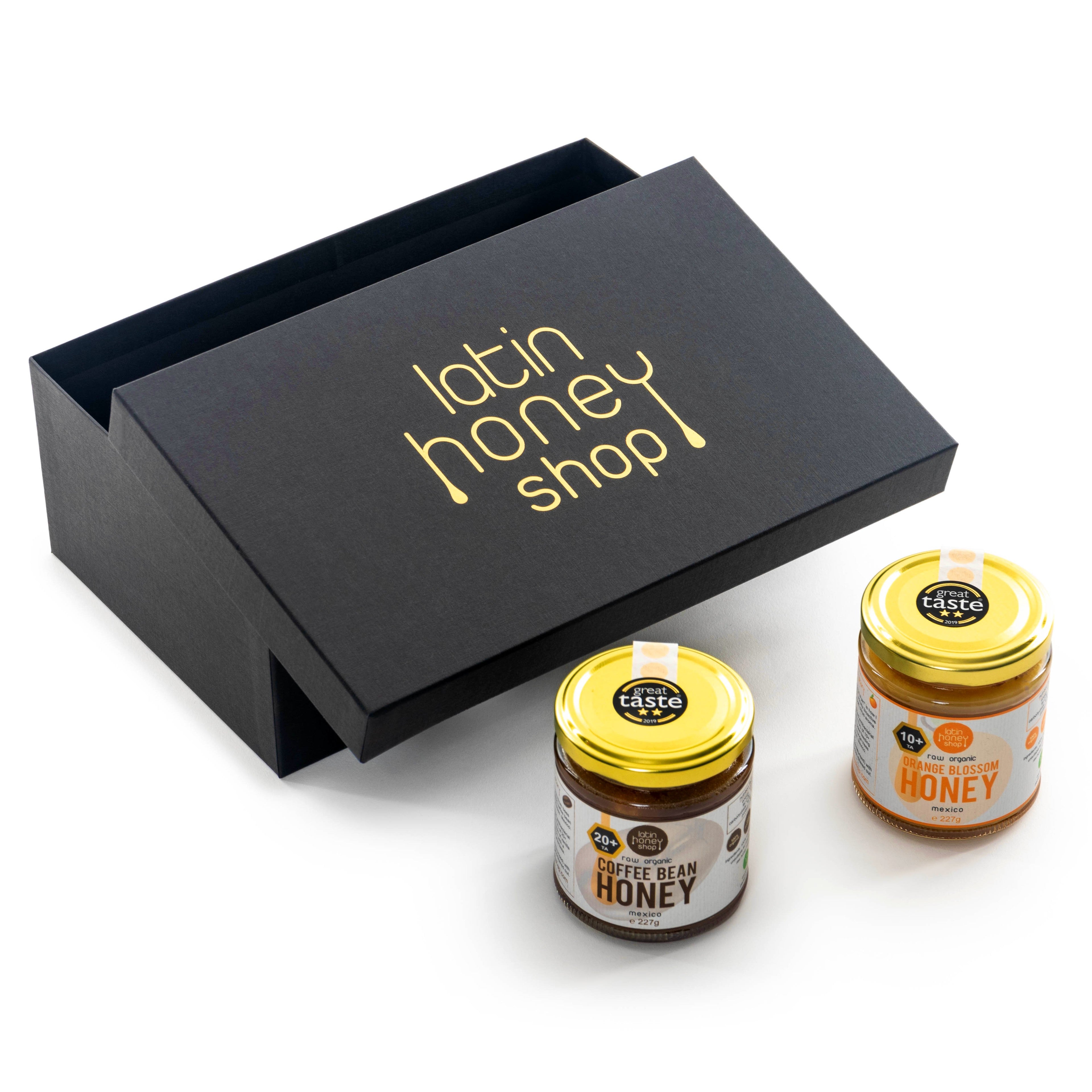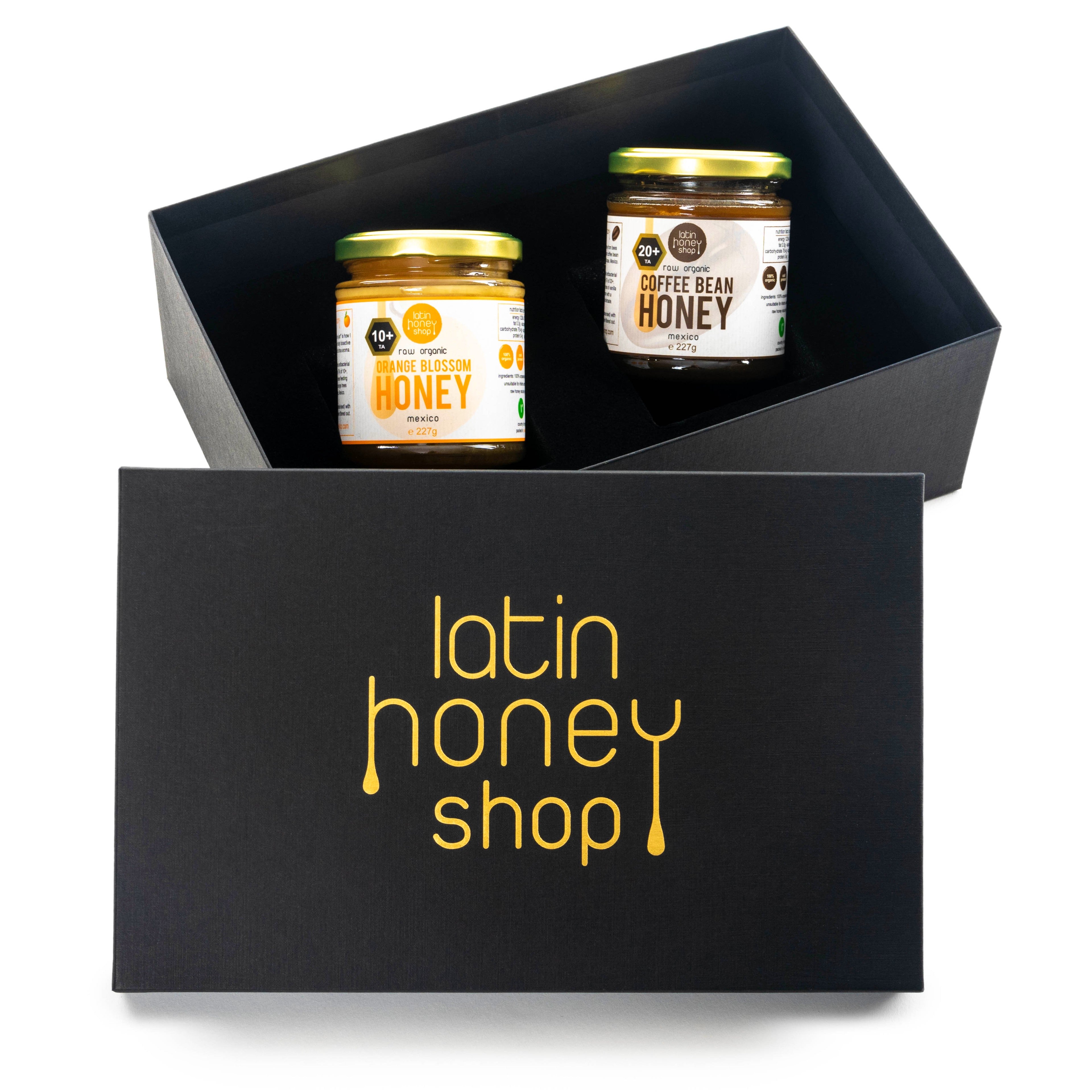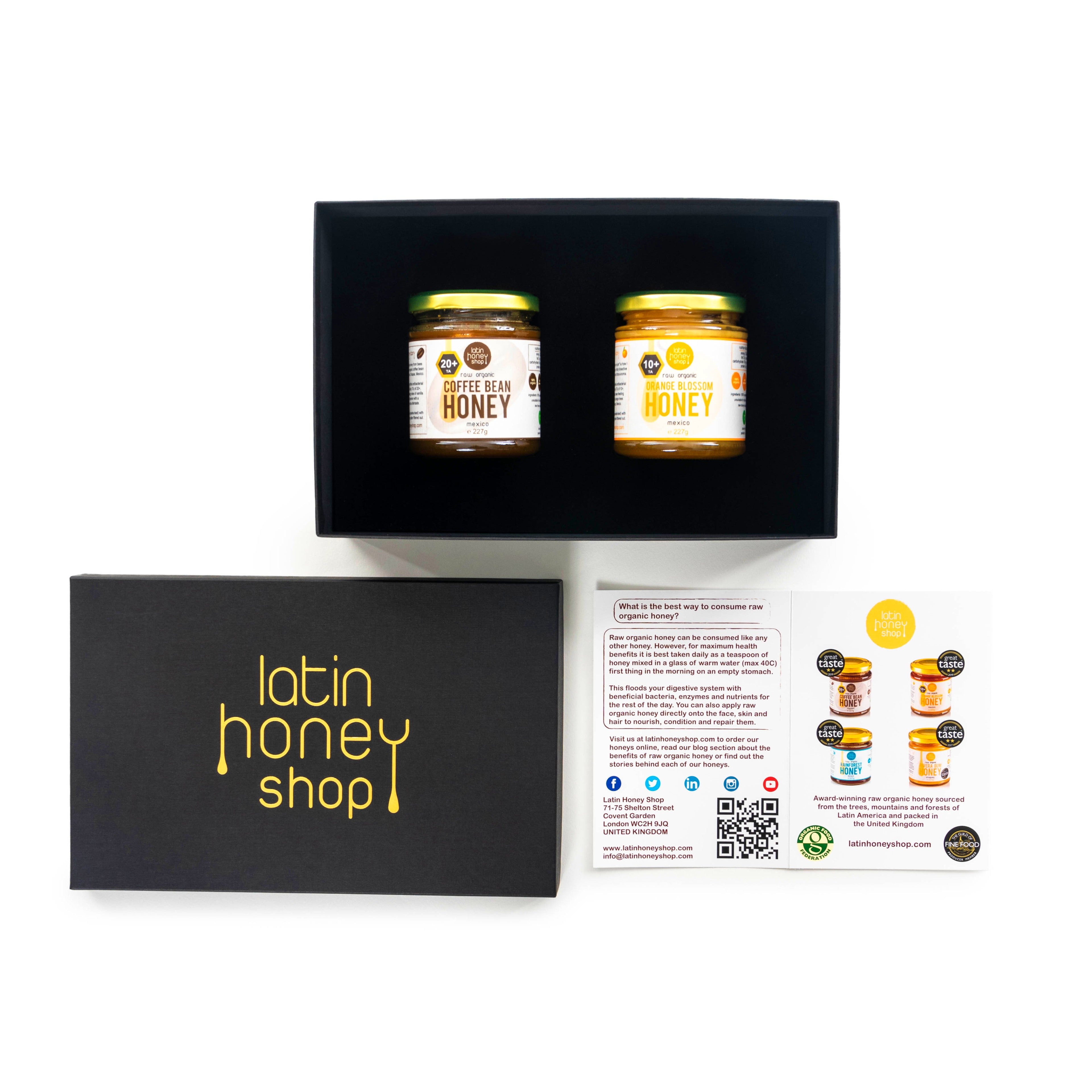 It contains two jars of some of the world's rarest organic antibiotic honeys both enclosed in a gold embossed luxury gift box with velvet foam that we had custom made in Germany.