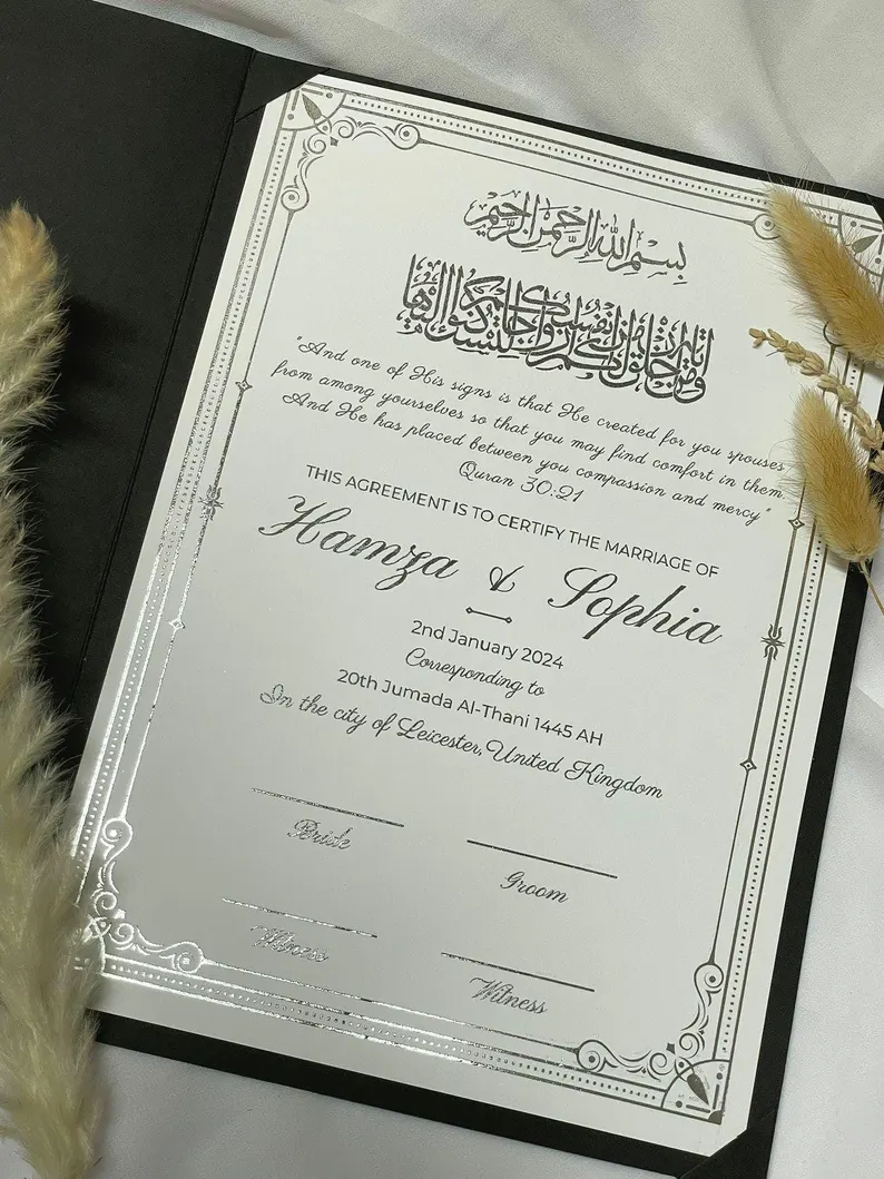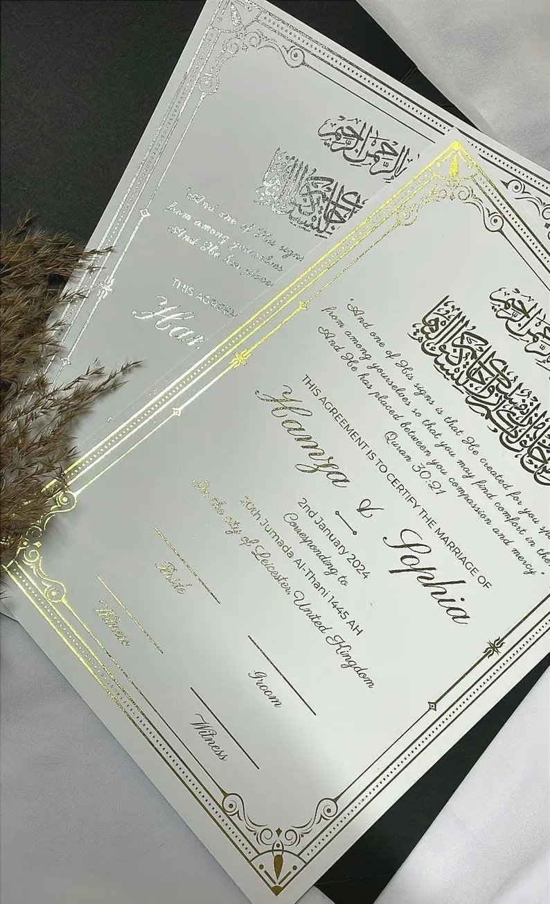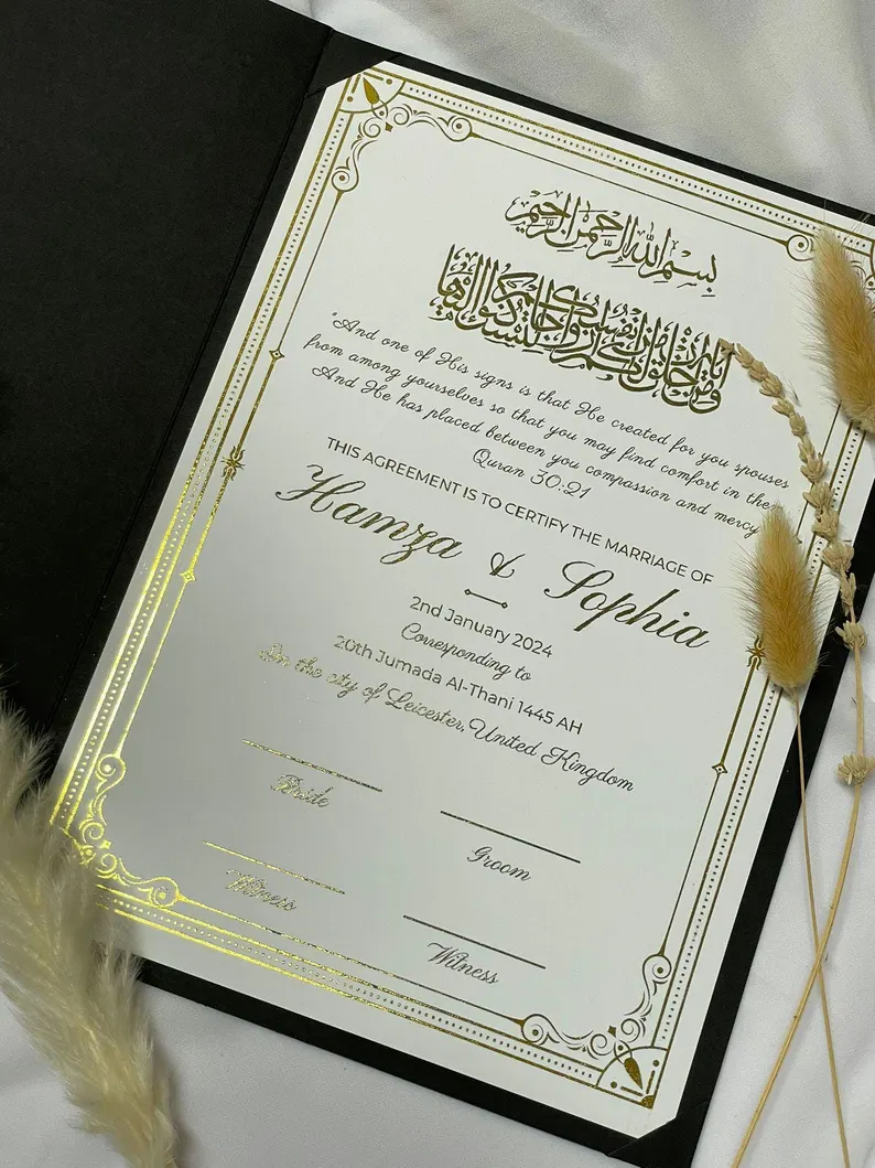 Celebrate your special day with a Custom Foiled Nikkah Certificate that beautifully captures the essence of your Islamic marriage. This personalised Nikkah certificate is the perfect keepsake to honor your wedding and is designed to be a timeless reminder of your sacred union.