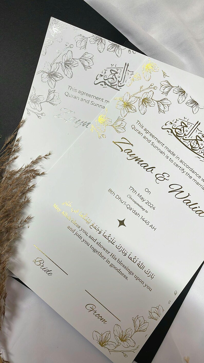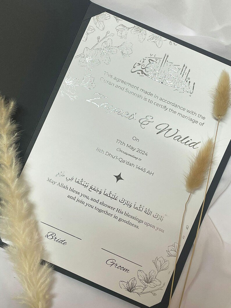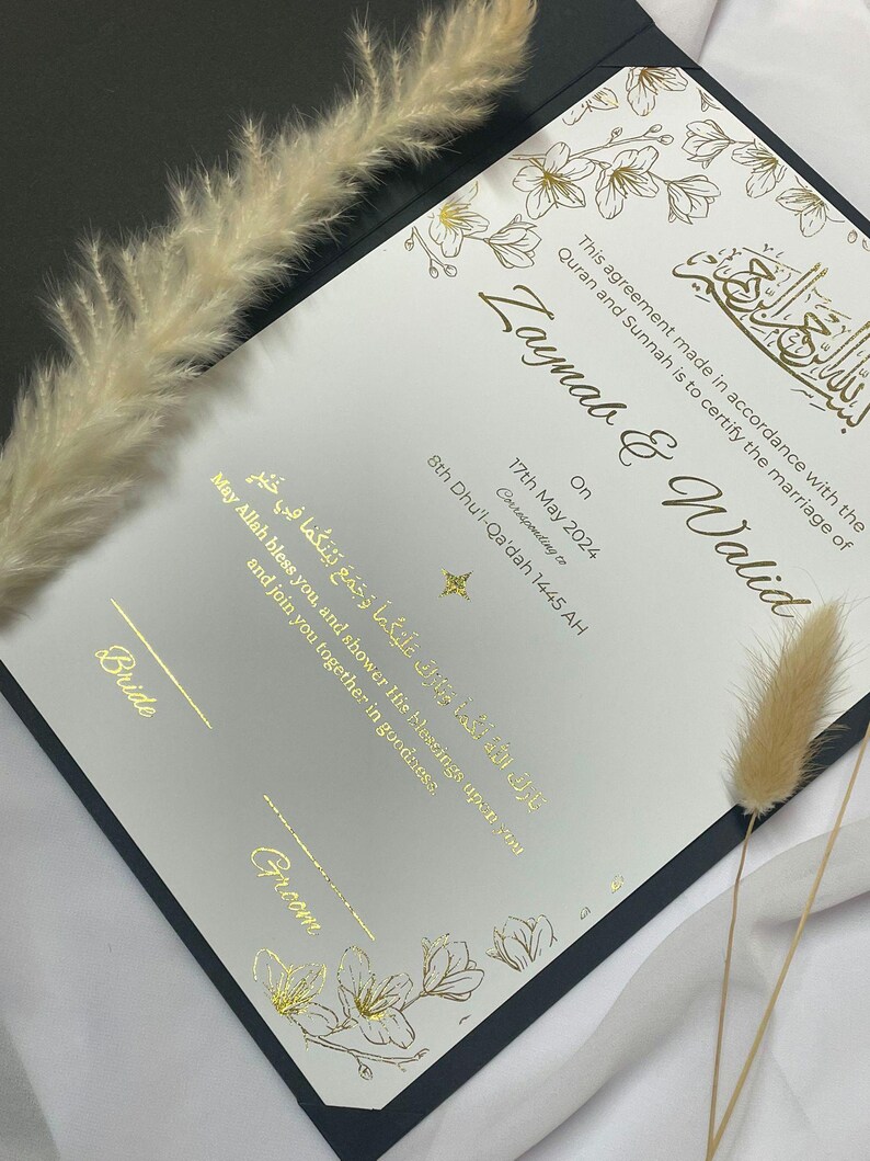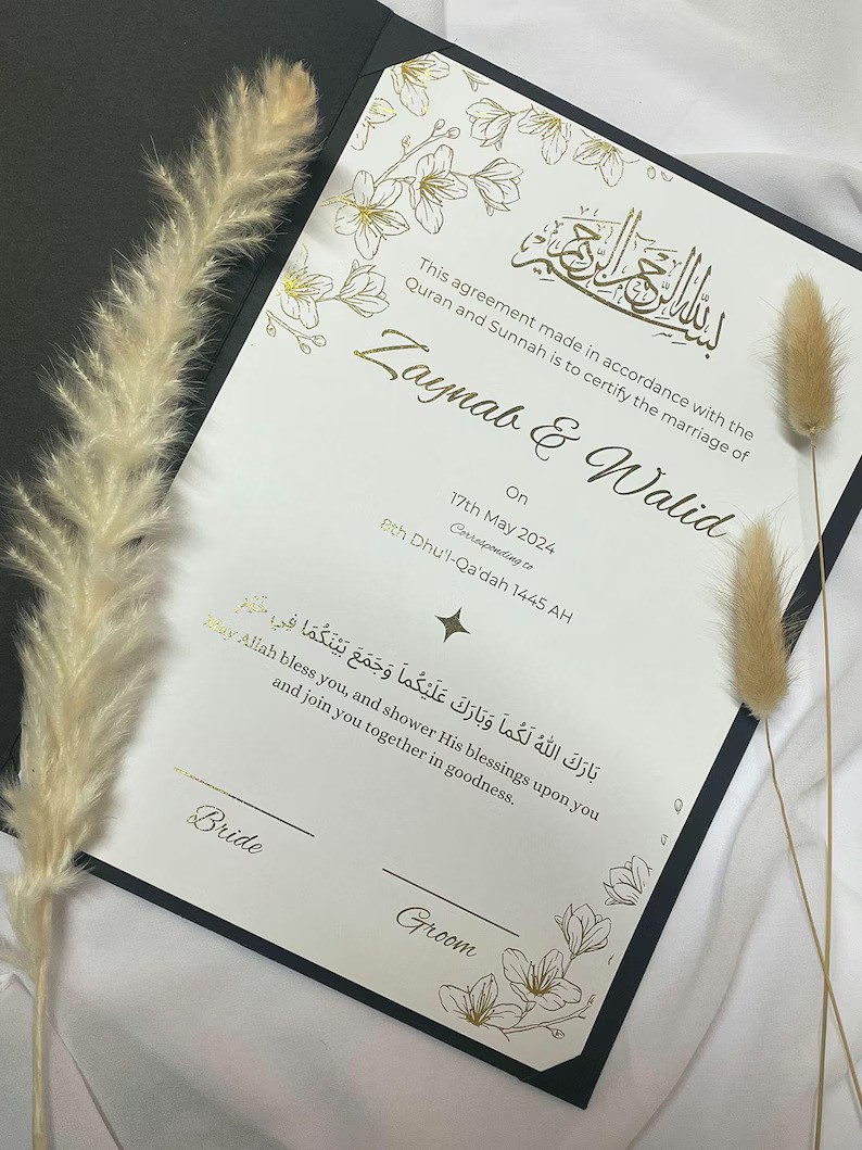 Celebrate your special day with a Custom Foiled Nikkah Certificate that beautifully captures the essence of your Islamic marriage. This personalised Nikkah certificate is the perfect keepsake to honor your wedding and is designed to be a timeless reminder of your sacred union.