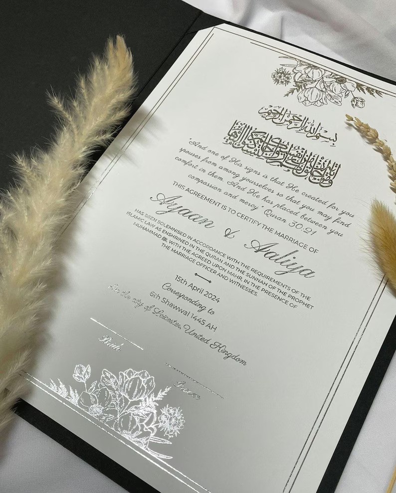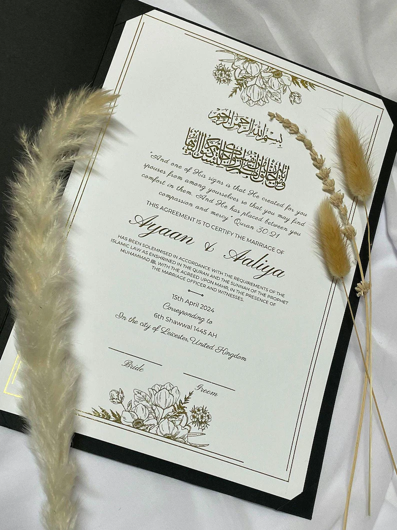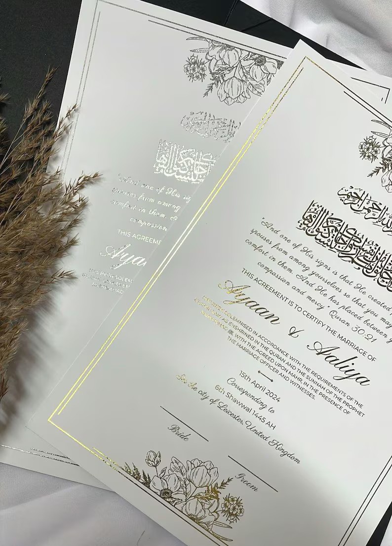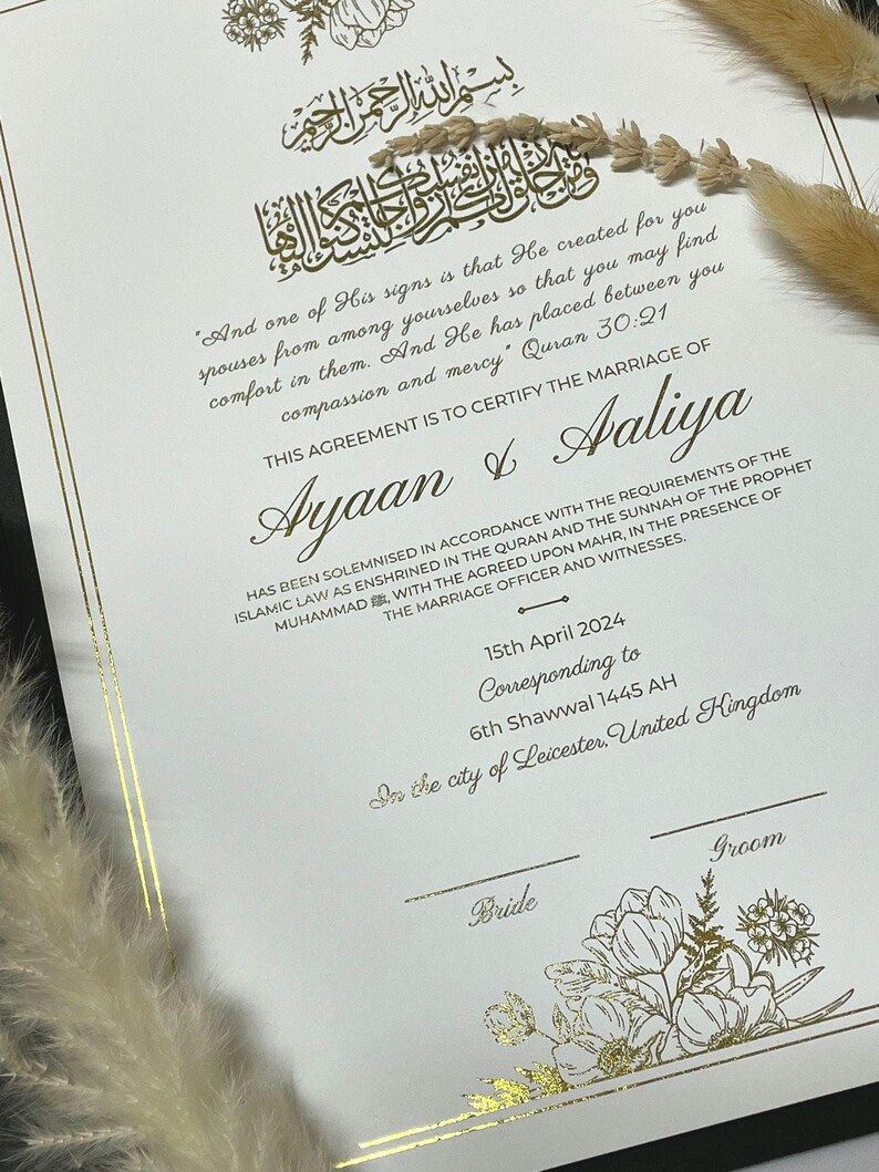 Celebrate your special day with a Custom Foiled Nikkah Certificate that beautifully captures the essence of your Islamic marriage. This personalised Nikkah certificate is the perfect keepsake to honor your wedding and is designed to be a timeless reminder of your sacred union.
