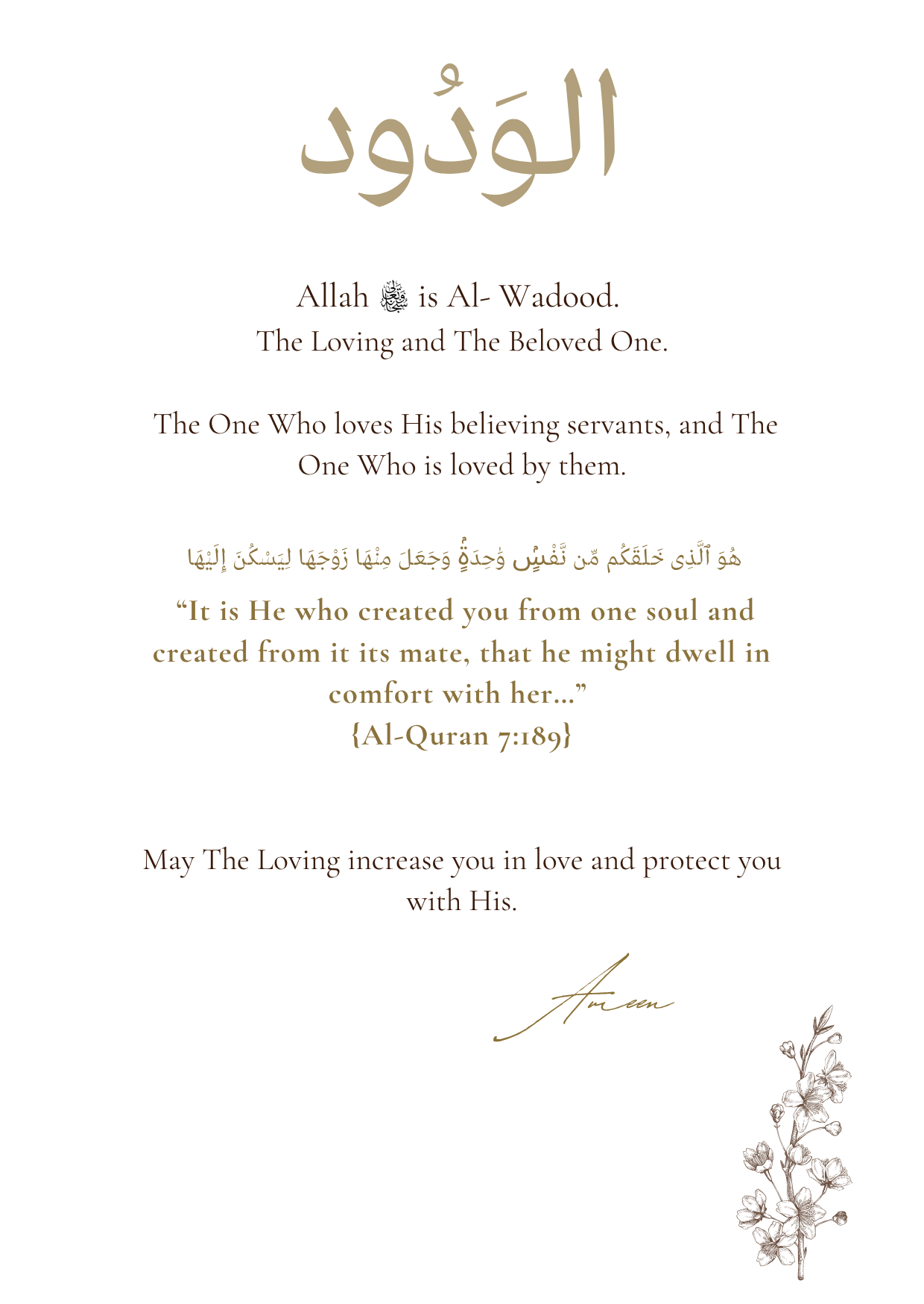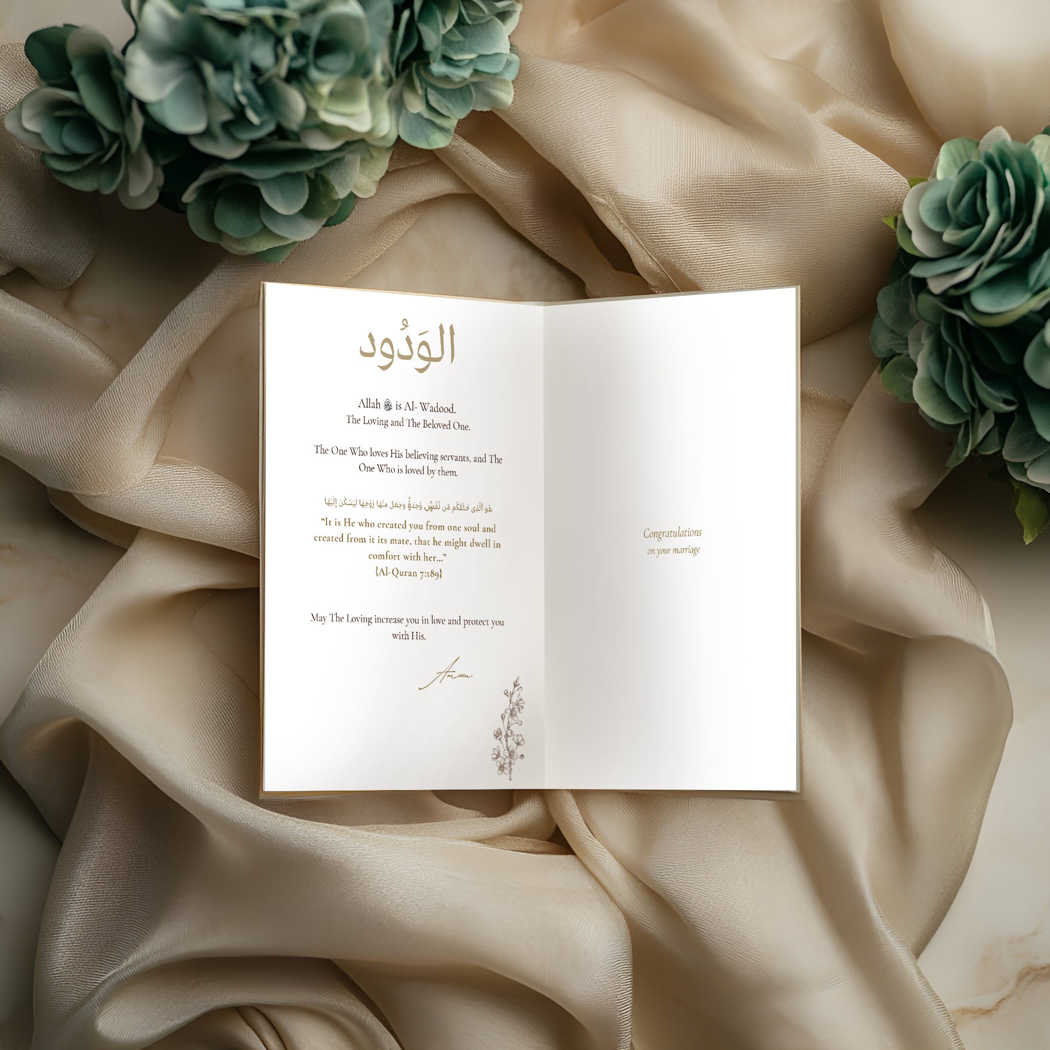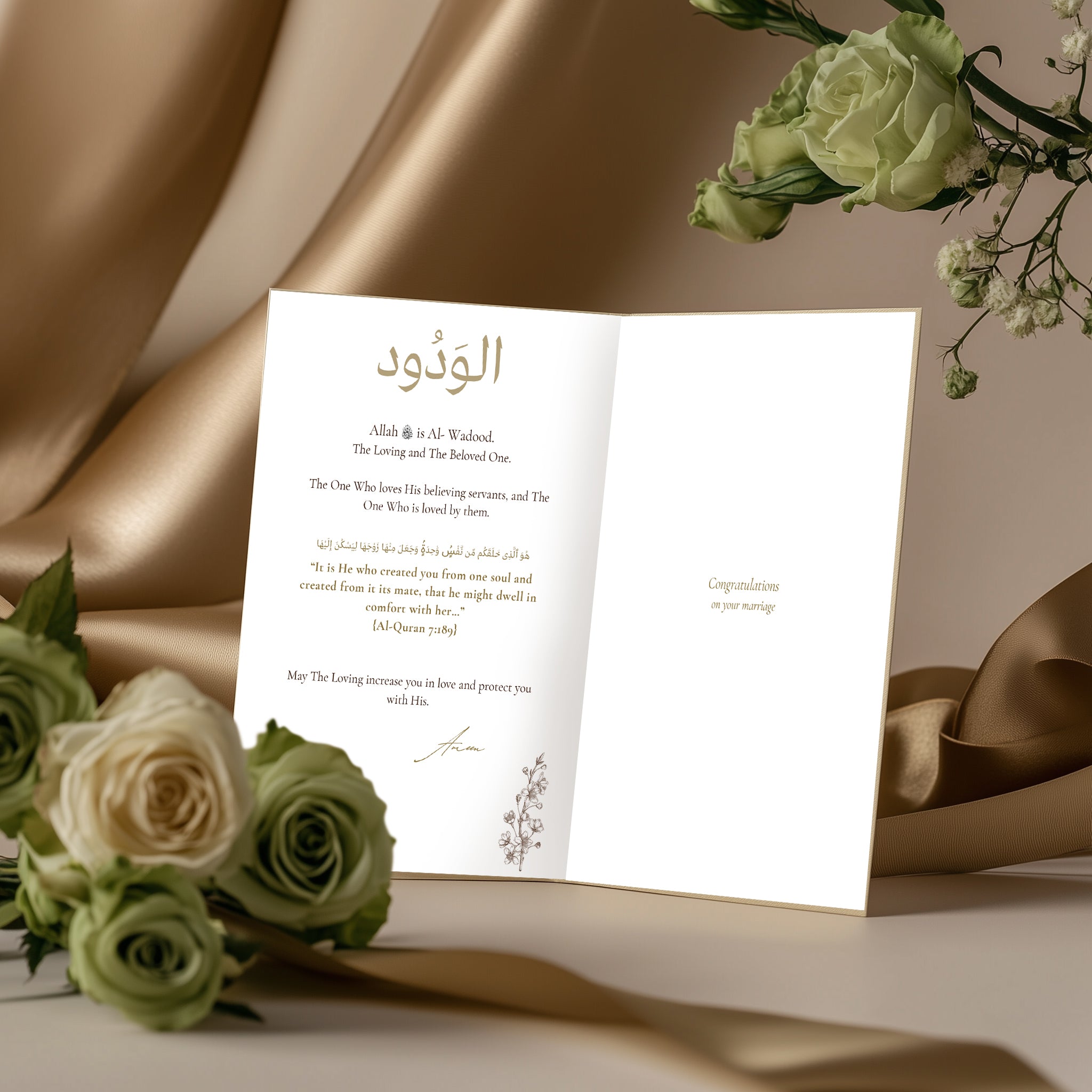 Share a heartfelt congratulations rooted in faith with our Ivory Nikkah Marriage Card, an elegant Islamic greeting card that celebrates love, unity, and Allah’s mercy. Featuring the beautiful divine name الوَدُود (Al-Wadood) – The Loving – this card is a perfect token for any couple beginning their journey together.