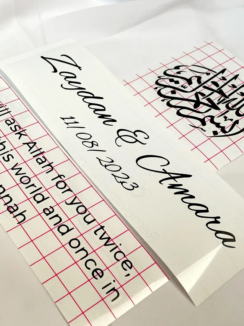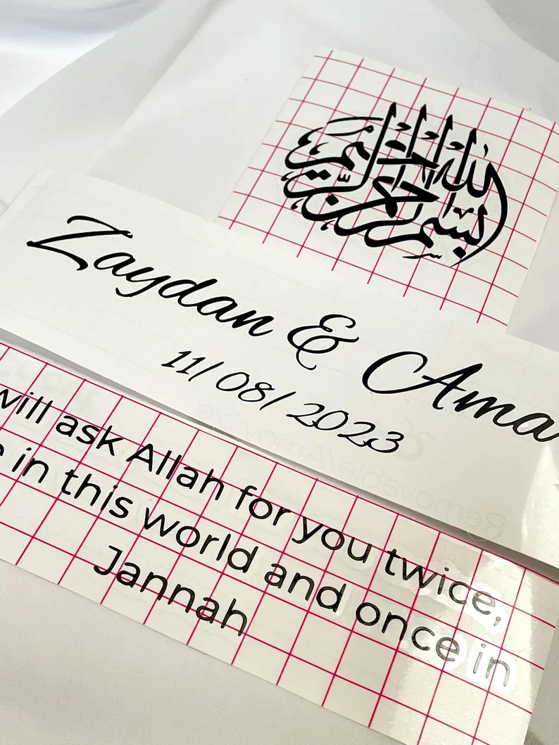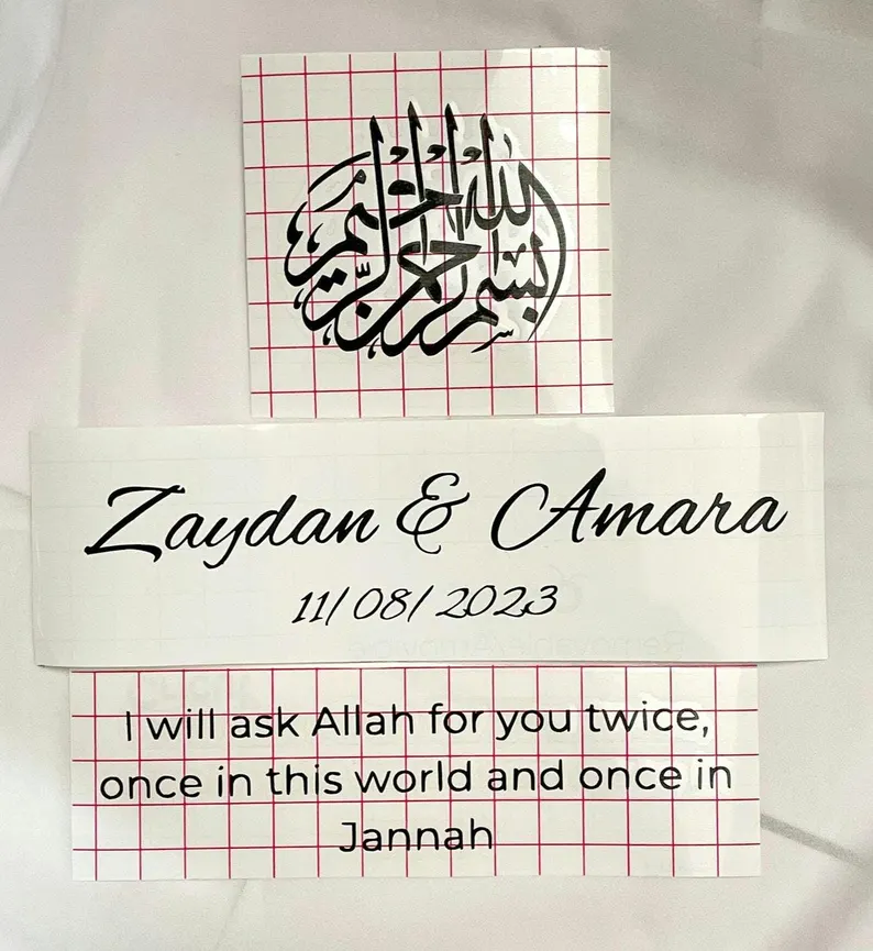 Text: > Bismillah > Name & Name > Date- In the format of Day/Month/Year (e.g 09/03/2023) > Quranic Ayah in English ** If you would like additional text, please message me **