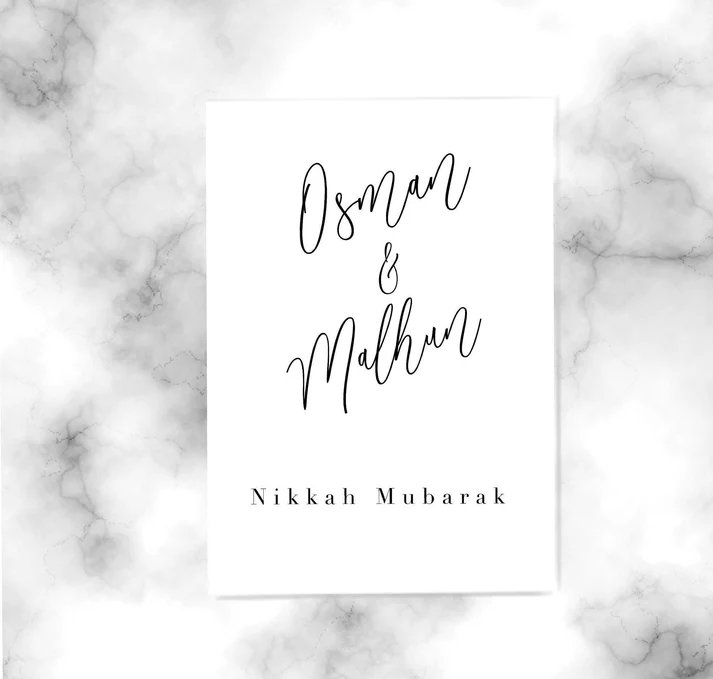 Our Personalised A5 Elegant Nikkah card This is an elegant modern card which doesn't have too much going on and is easy on the eye. The couples name is in a stylish font. This is a great gift for newly weds, it will surely make them realise how much effort you went through to gift a personalised Nikkah card. We can print a personalised message for you inside the card. Please fill in the details in personalised section.