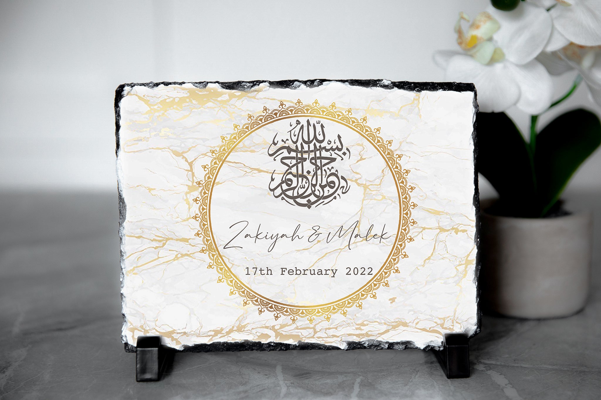 Our Personalised Grey Text Bismillah Calligraphy Rock Slate Gift with a gold round frame