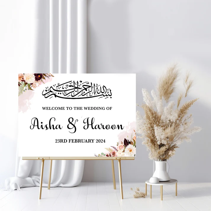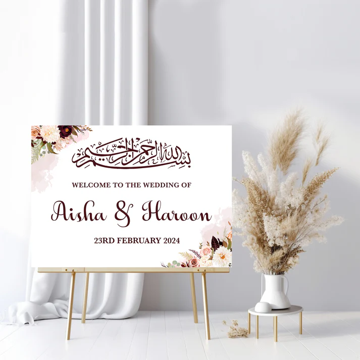 Our Personalised Bismillah Pink Floral Foam Sign are a must buy to add to your wedding shopping list! They stand out beautifully and are sure to make a good impression when guests first arrive. Our Signs are exclusively designed with love and care. They are great to gift loved ones and makes a lovely memento for them to keep.