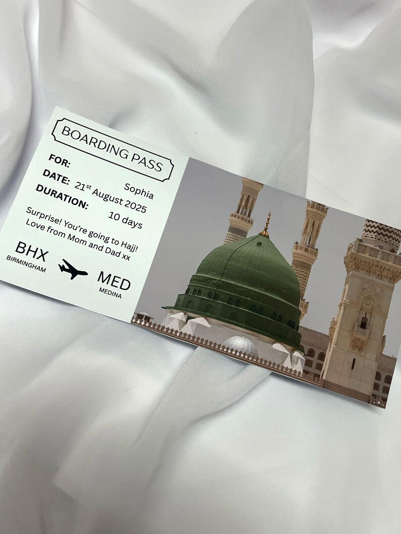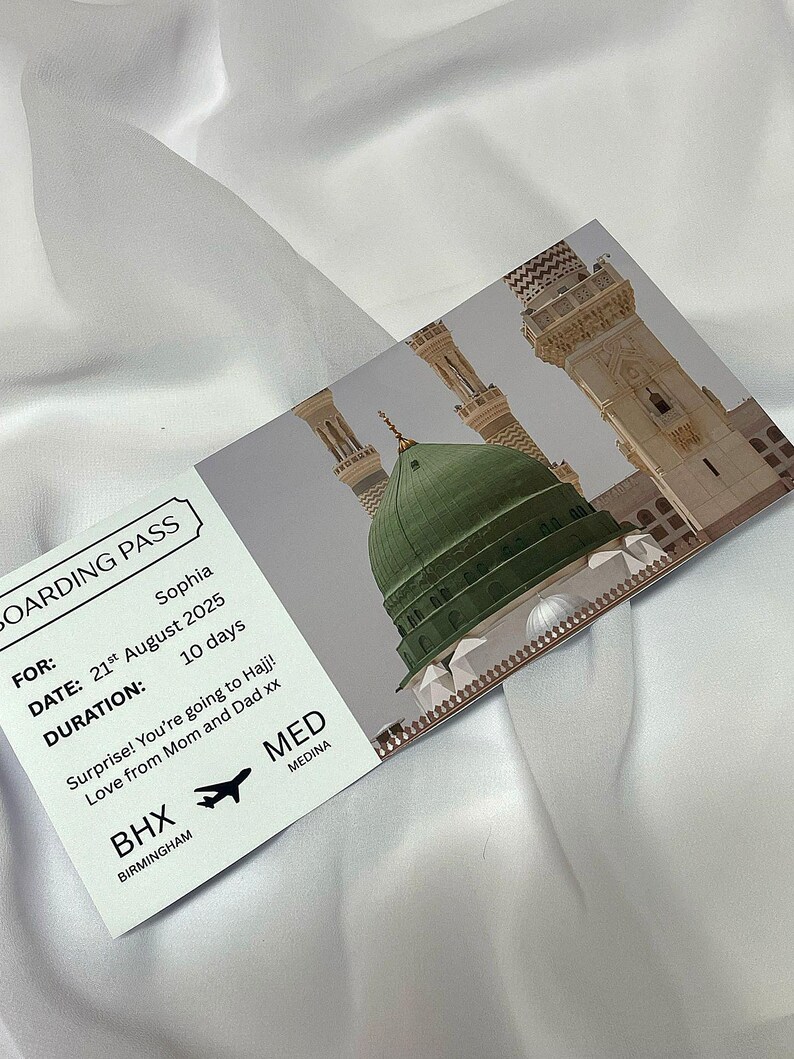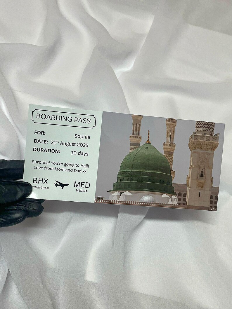 Surprise a loved one with a spiritual journey of a lifetime! This personalised Hajj or Umrah boarding pass is the perfect way to announce, reveal, or gift a sacred pilgrimage. Thoughtfully designed with Islamic elegance and heartfelt detail, it’s more than a gift—it’s a memory in the making.
