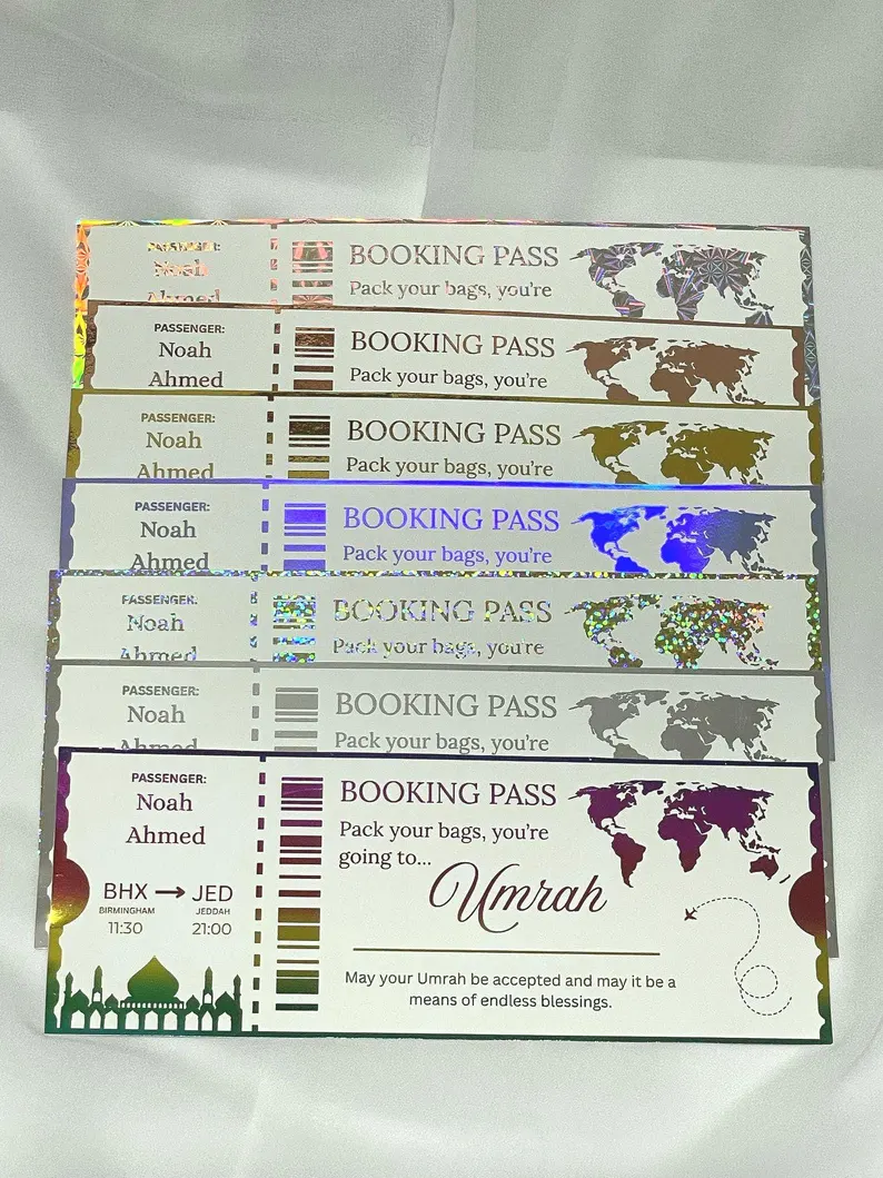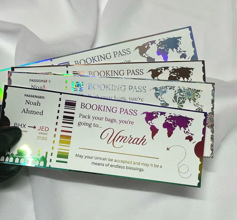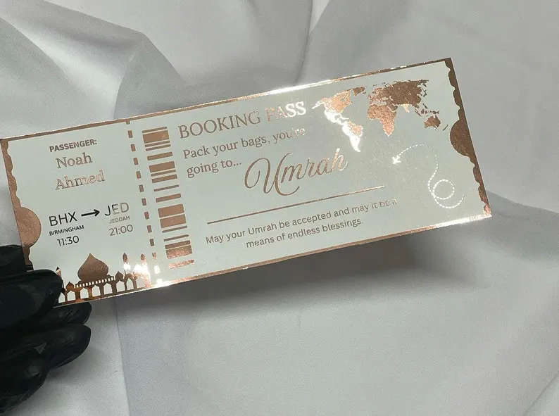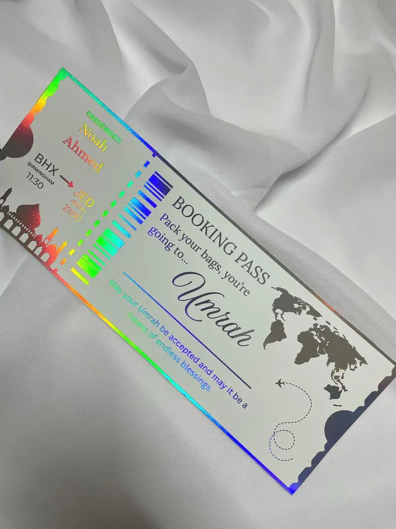 Surprise a loved one with a spiritual journey of a lifetime! This personalised Hajj or Umrah boarding pass is the perfect way to announce, reveal, or gift a sacred pilgrimage. Thoughtfully designed with Islamic elegance and heartfelt detail, it’s more than a gift—it’s a memory in the making.