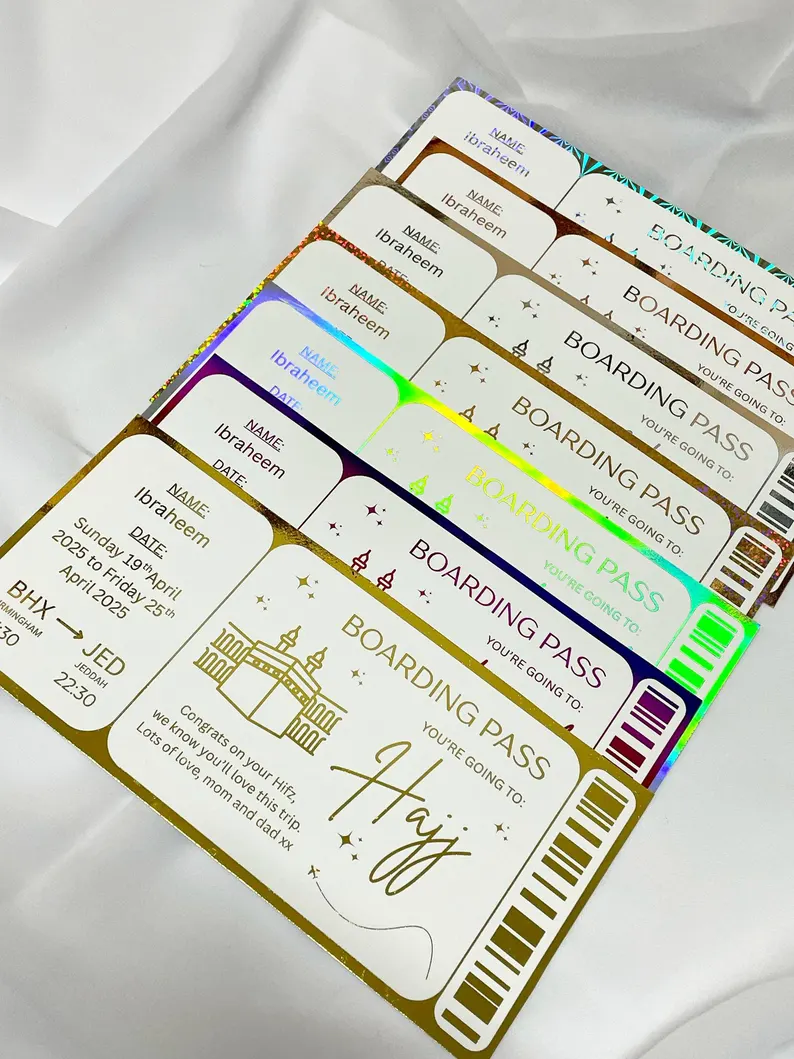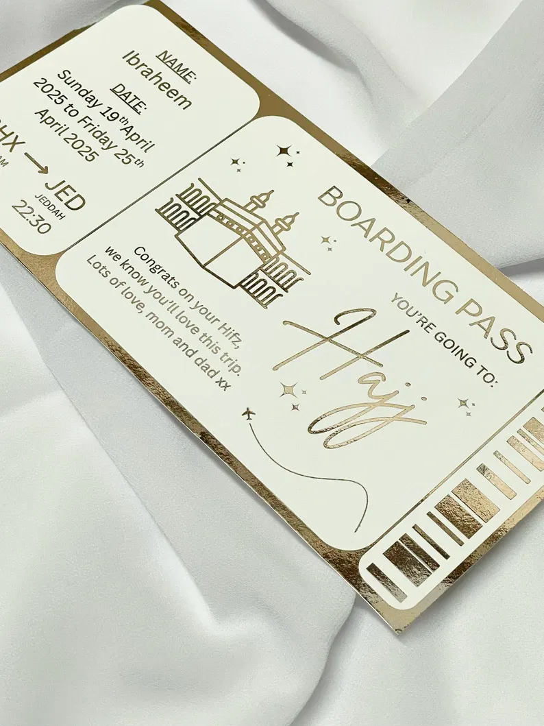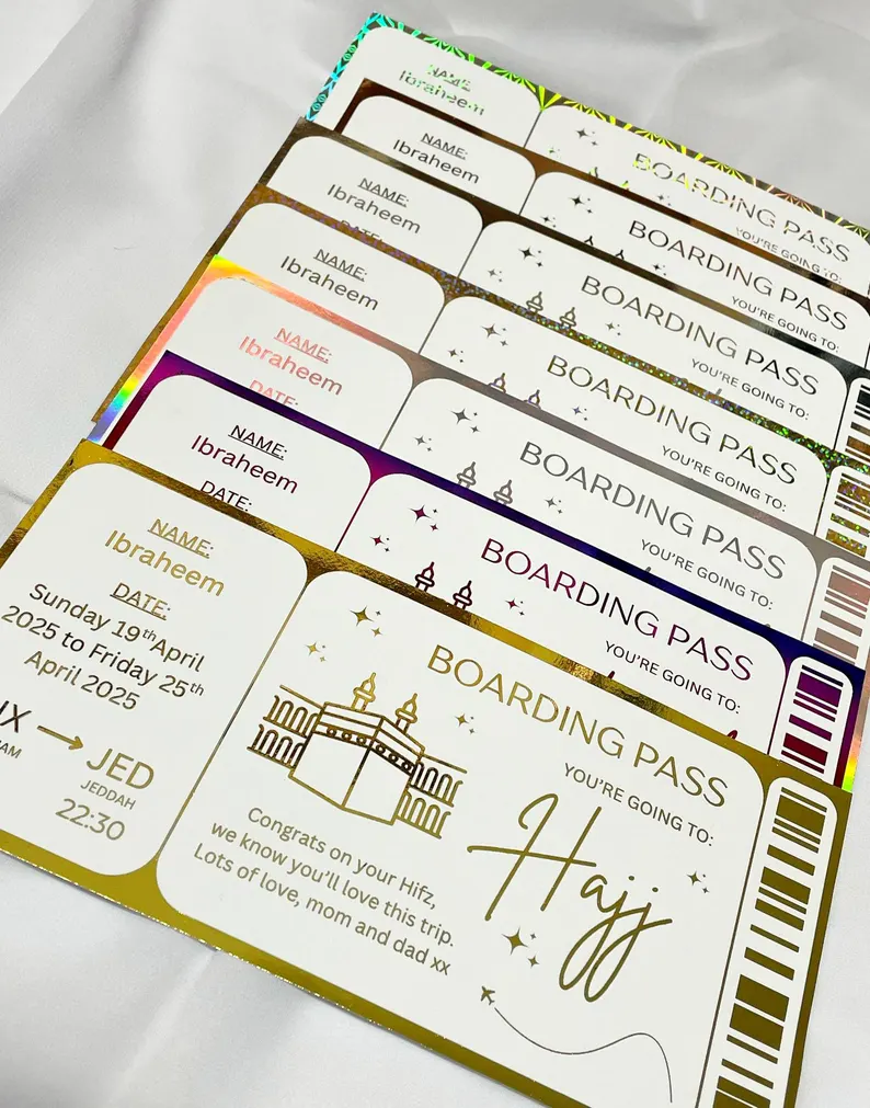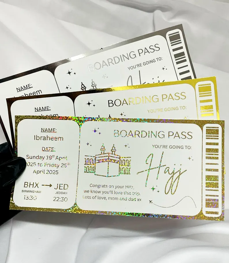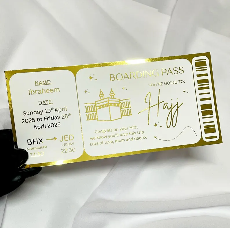 Surprise a loved one with a spiritual journey of a lifetime! This personalised Hajj or Umrah boarding pass is the perfect way to announce, reveal, or gift a sacred pilgrimage. Thoughtfully designed with Islamic elegance and heartfelt detail, it’s more than a gift—it’s a memory in the making.