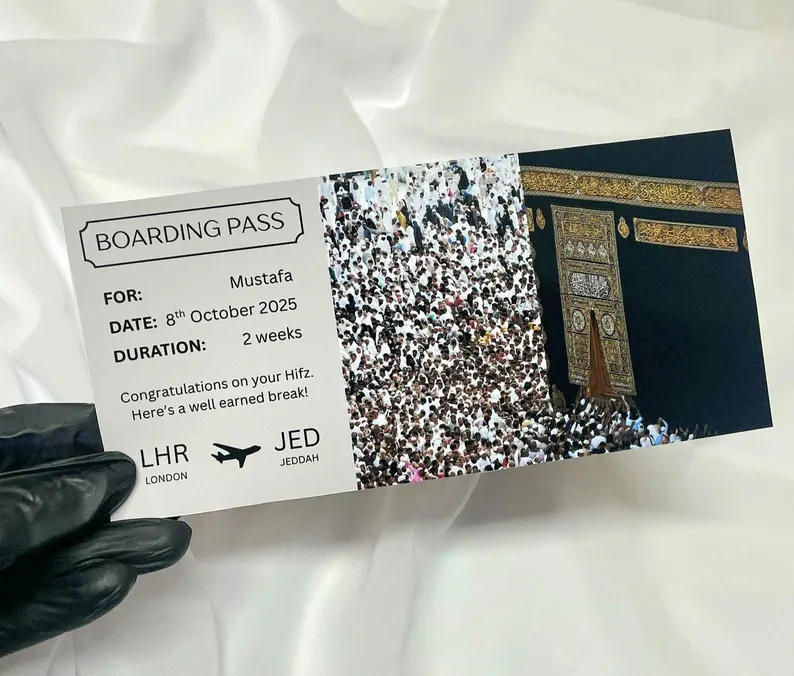 Surprise a loved one with a spiritual journey of a lifetime! This personalised Hajj or Umrah boarding pass is the perfect way to announce, reveal, or gift a sacred pilgrimage. Thoughtfully designed with Islamic elegance and heartfelt detail, it’s more than a gift—it’s a memory in the making.
