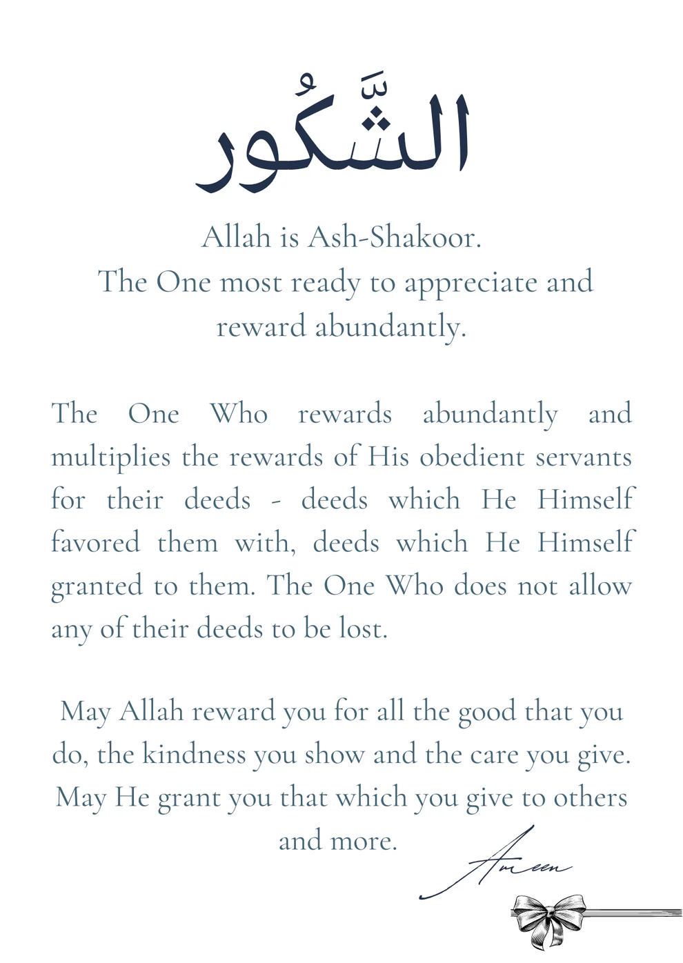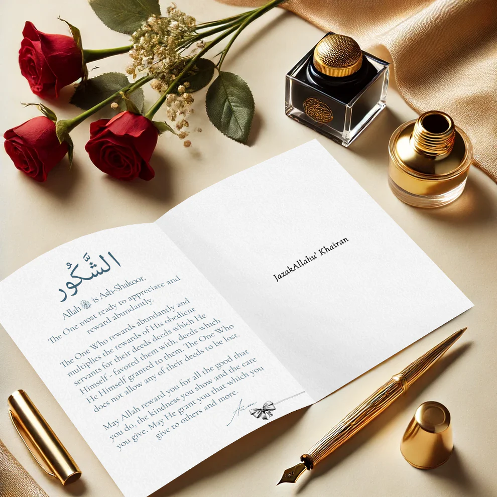 - Inside, the card features one of Allah's beautiful Names الشَّكُور (Ash-Shakoor) - The Most Appreciative.