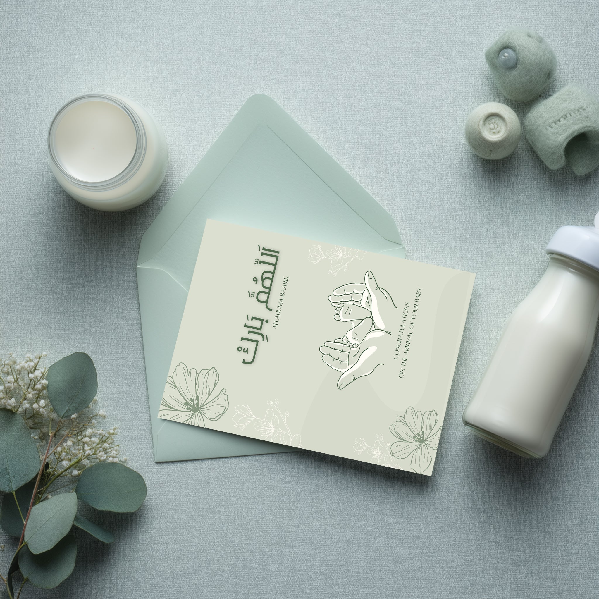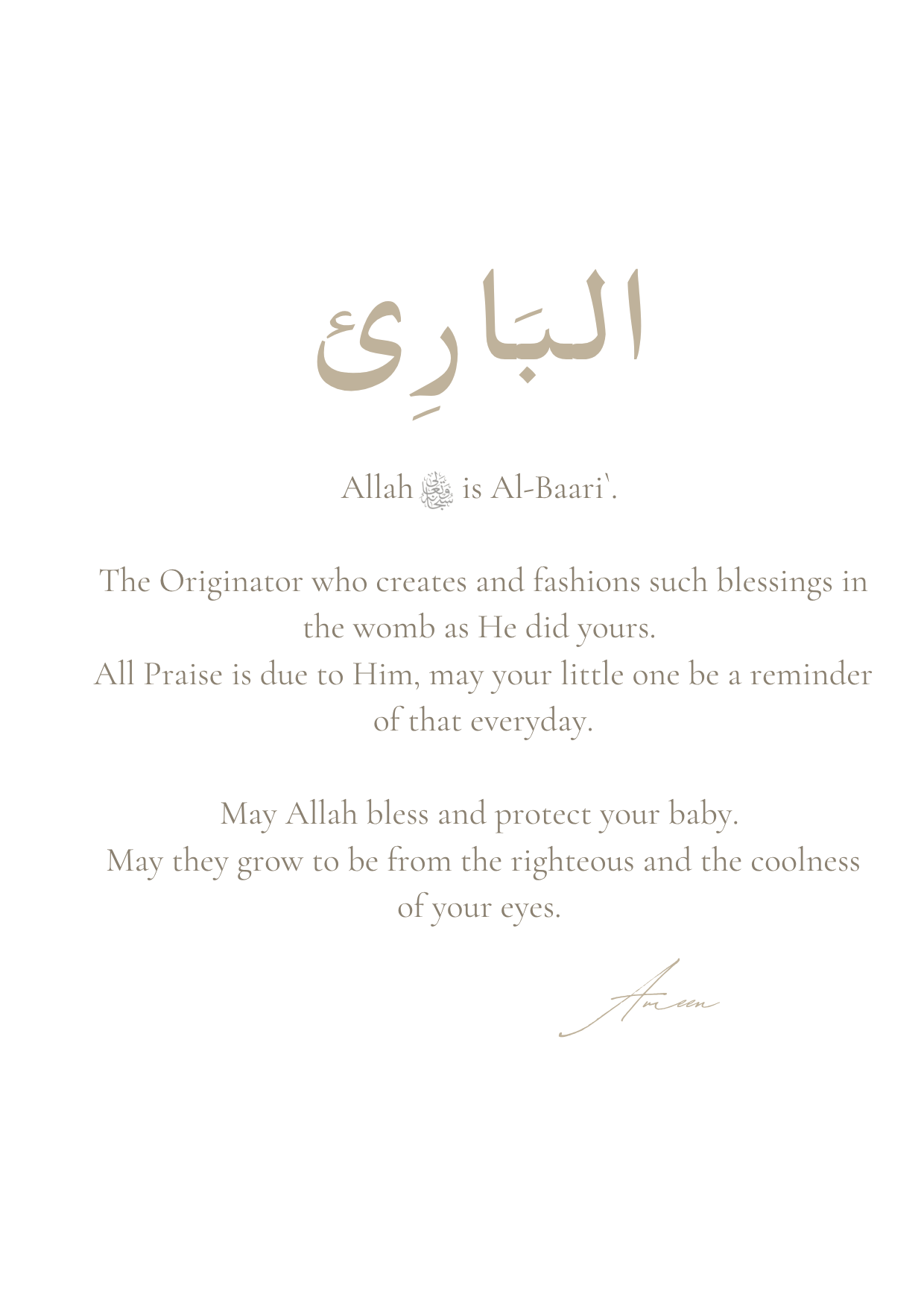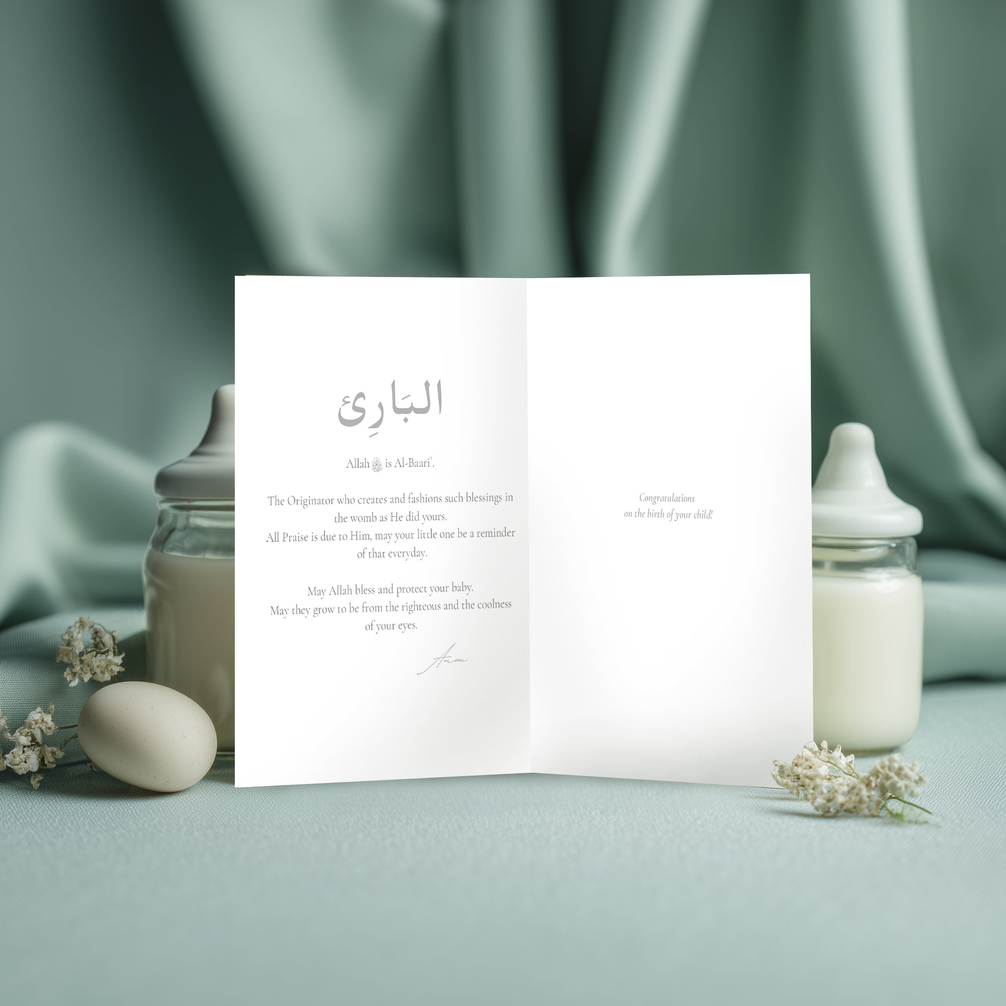 Inner Message - The inner title features البَارِئ (Al-Baari`), The Originator, one of Allah's names that beautifully resonates with the birth of a new life. The body of the message is a prayer for the newborn, invoking Allah's blessings and protection: “May Allah bless and protect your baby. Ameen.” This message serves as a reminder that every child is a testament to Allah's magnificent creation, encouraging parents to reflect on this blessing in their journey of parenthood.