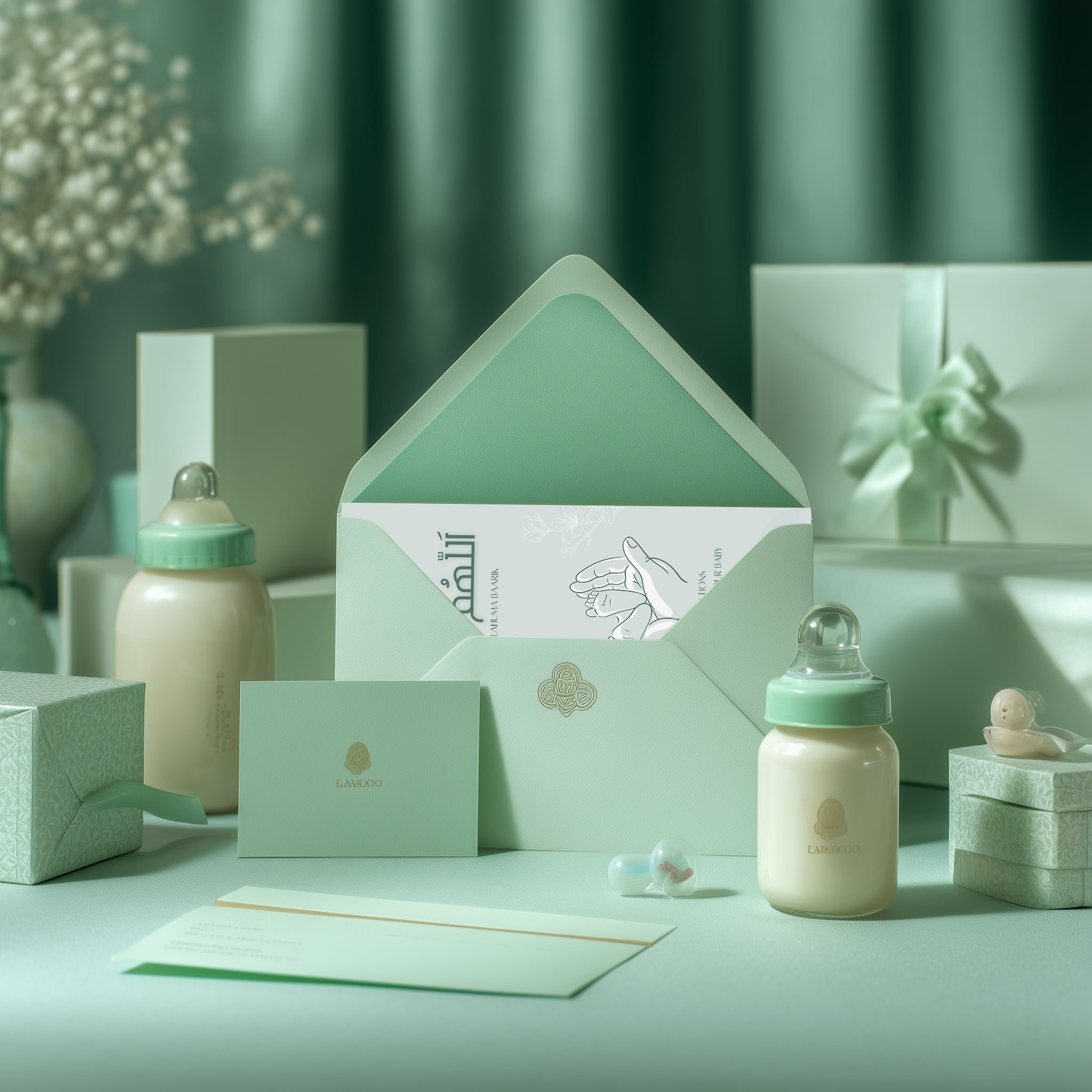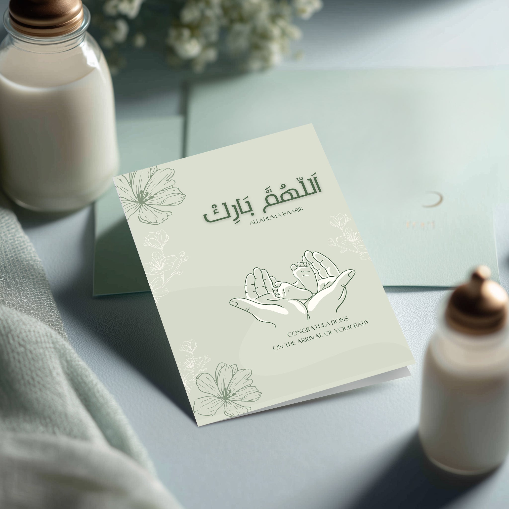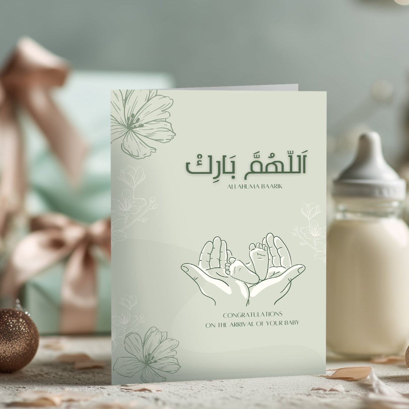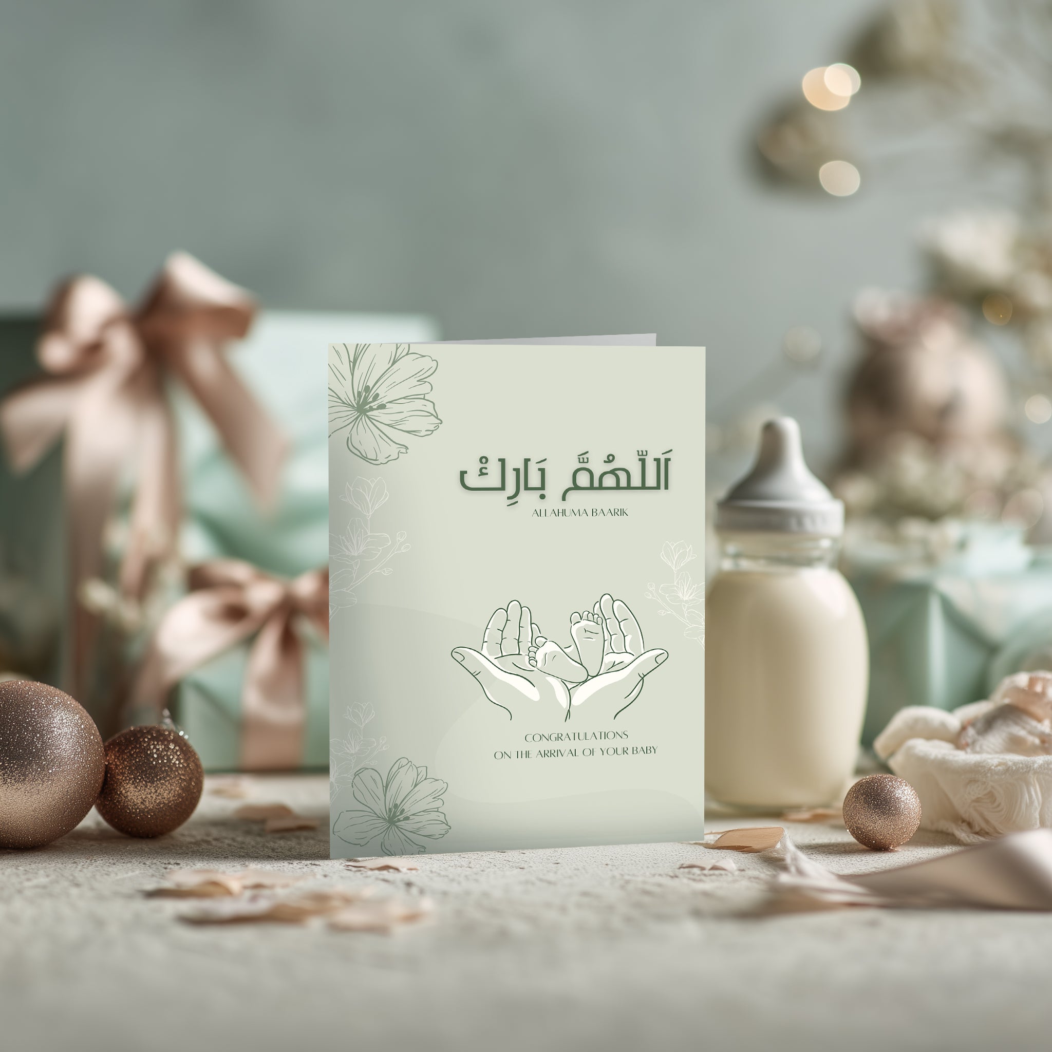 Inner Message - The inner title features البَارِئ (Al-Baari`), The Originator, one of Allah's names that beautifully resonates with the birth of a new life. The body of the message is a prayer for the newborn, invoking Allah's blessings and protection: “May Allah bless and protect your baby. Ameen.” This message serves as a reminder that every child is a testament to Allah's magnificent creation, encouraging parents to reflect on this blessing in their journey of parenthood.