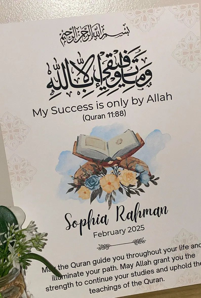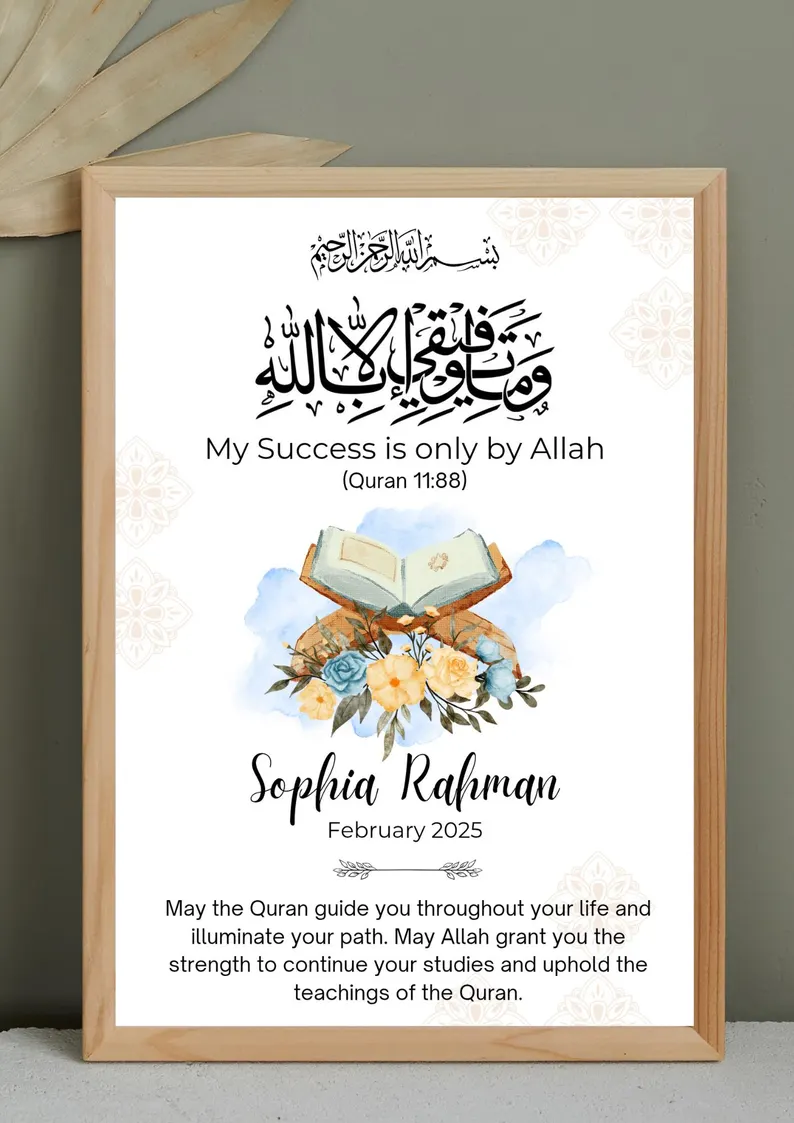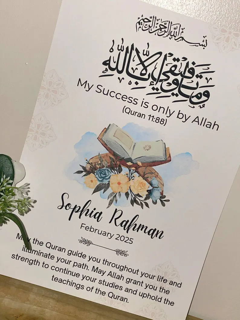 Celebrate your special occasion with a beautifully customised Quran Completion print, a perfect gift to cherish. This personalised print makes a unique, sentimental addition to any home.