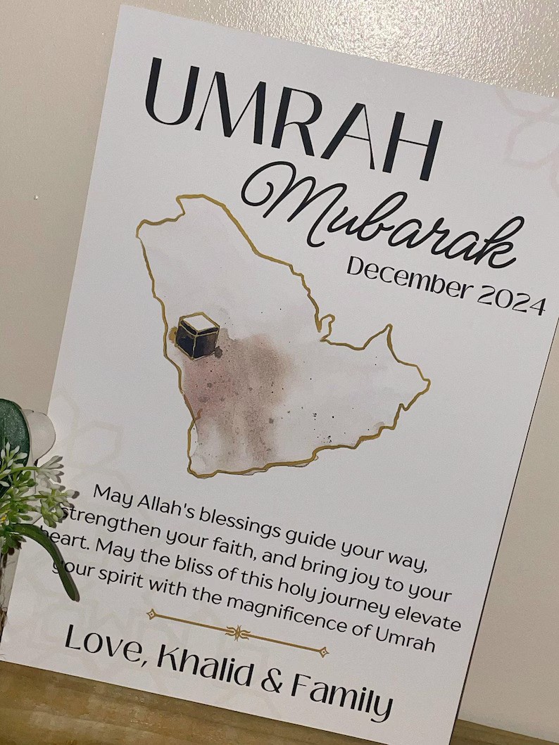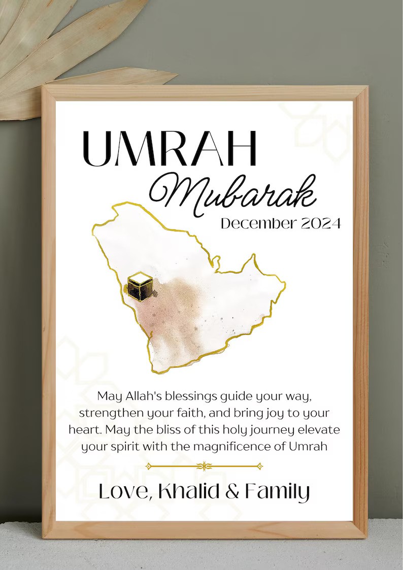 Celebrate your special occasion with a beautifully customised Umrah print, a perfect gift to cherish. This personalised print makes a unique, sentimental addition to any home.