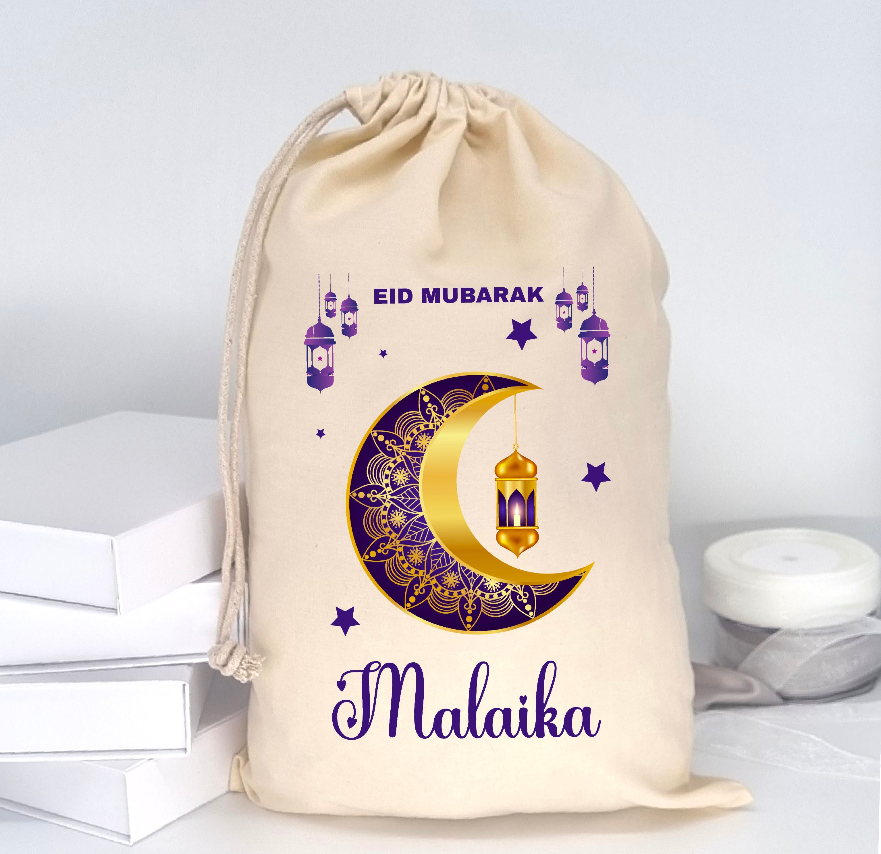 This is a Beautiful sack for Eid celebration with Name. This is special way to fill presents on Eid Day – and we've put together a range that will suit children and adults. These sacks are a great way to save on gift wrap. They can even be reused each year to bring even more festive joy. Our sacks are printed on, which means they will not fade or come off. Please ensure you check the size to avoid disappointment.