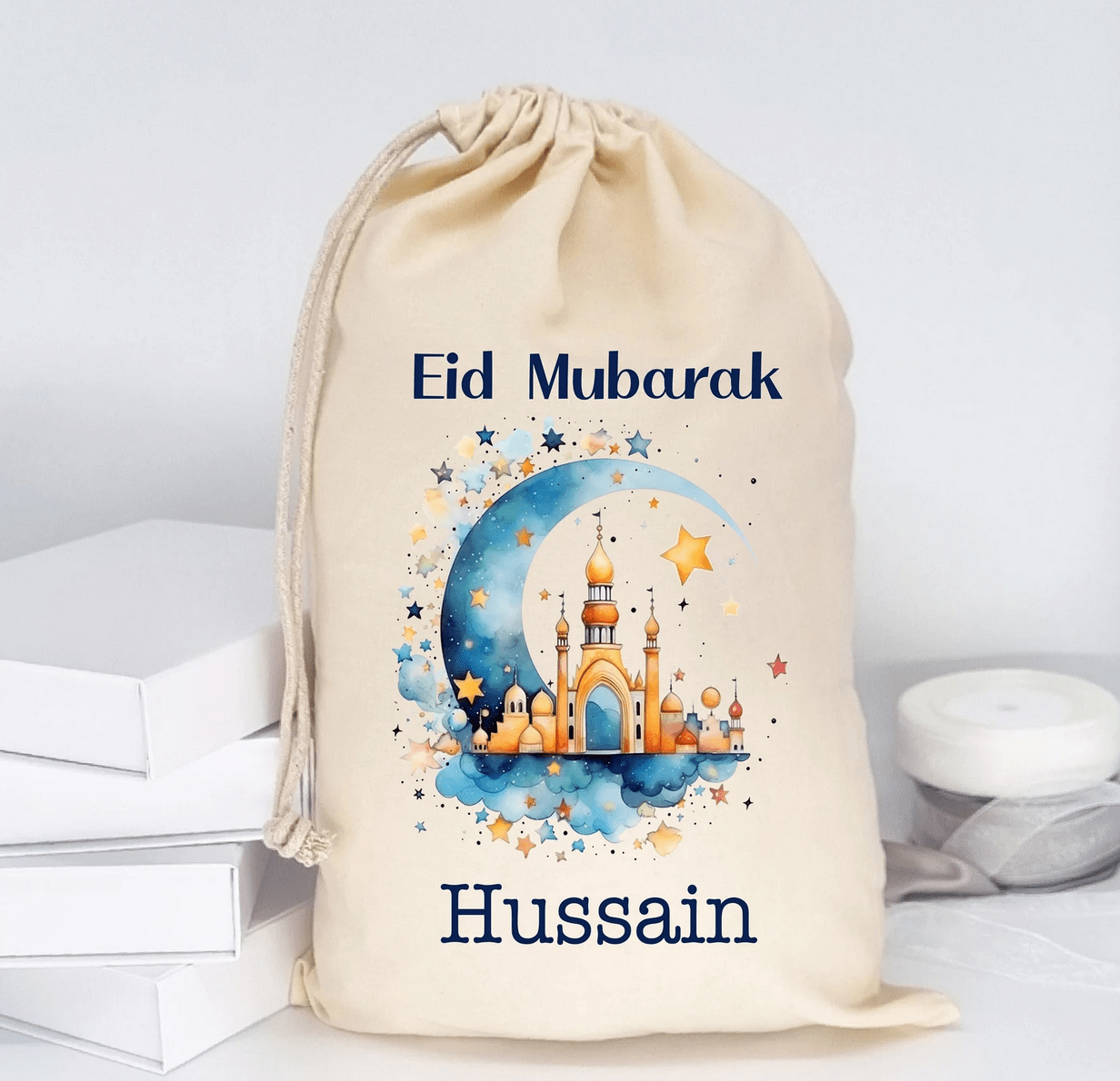 NEW Personalised Blue Moon Eid Mubarak Drawstring Sack with Name