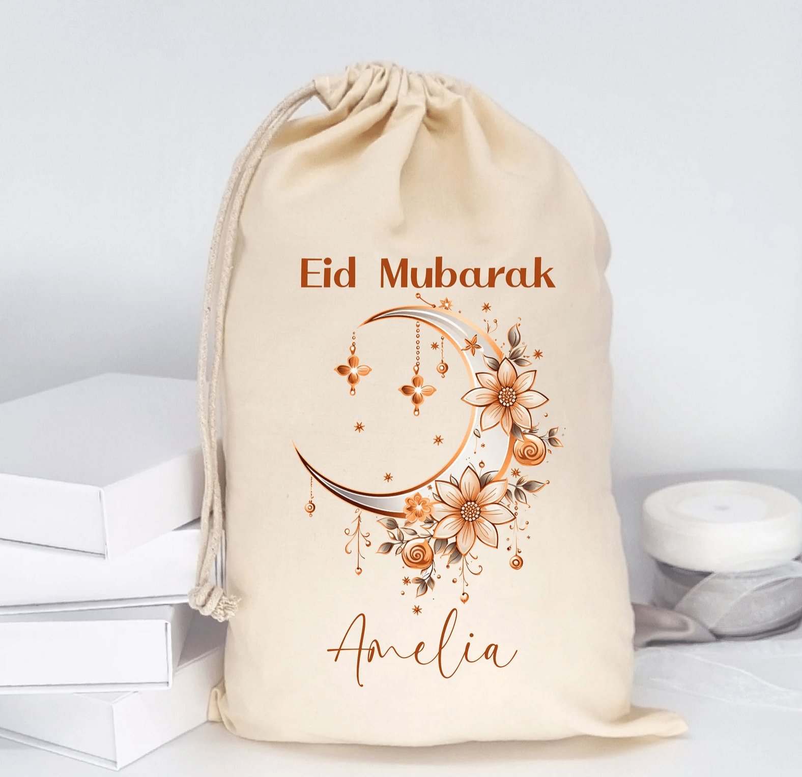 This is a pretty sack for Eid Presents with the recipients name personalised. This is a special way to fill presents on Eid Day – and we've put together a range that will suit children and adults. These sacks are a great way to save on gift wrap. They can even be reused each year to bring even more festive joy.