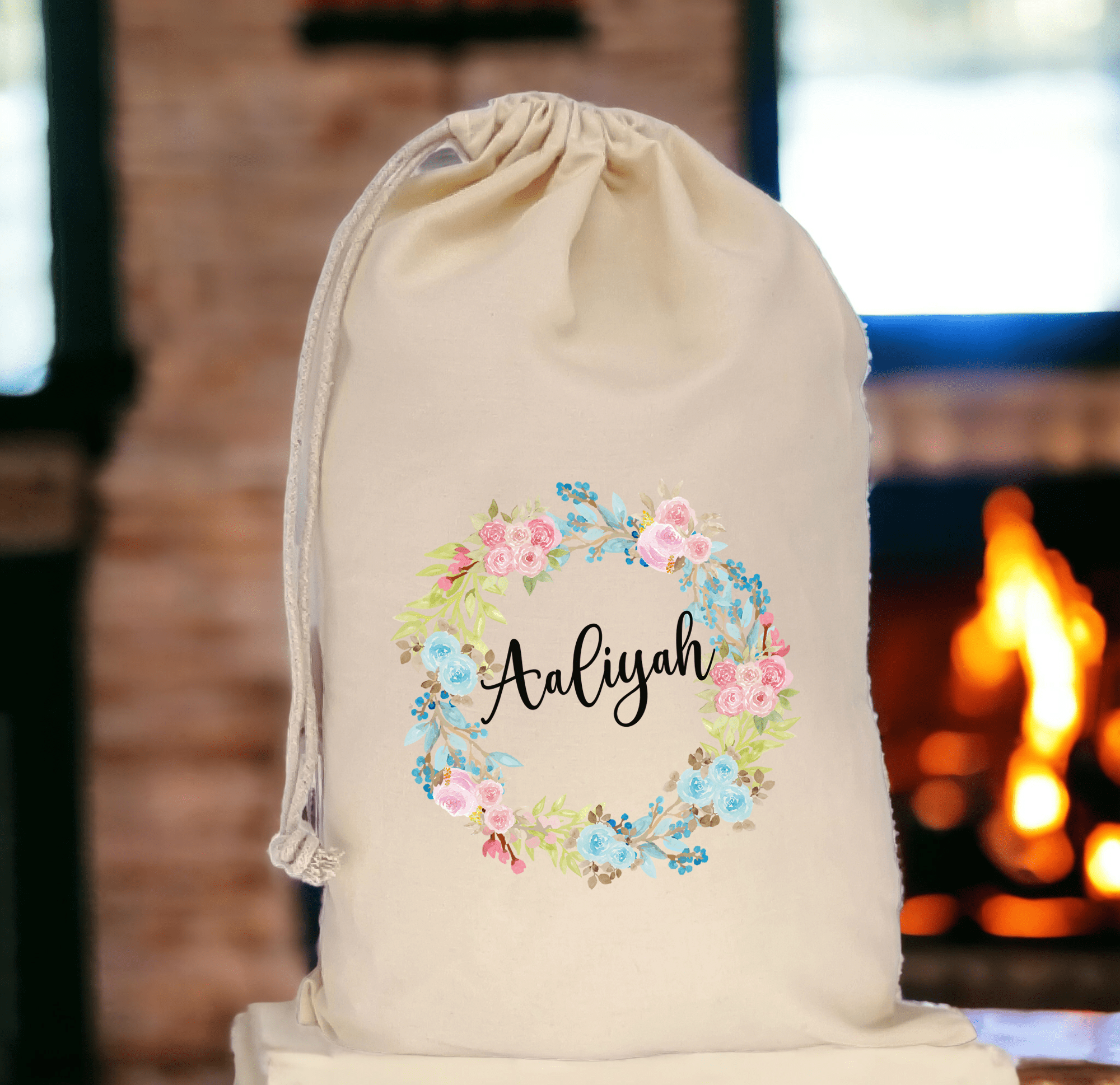This is a Pretty Floral sack for Eid celebration with recipients name . This is special way to fill presents on Eid Day or for Ramadan and we've put together a range that will suit children and adults. These sacks are a great way to save on gift wrap. They can even be reused each year to bring even more festive joy.