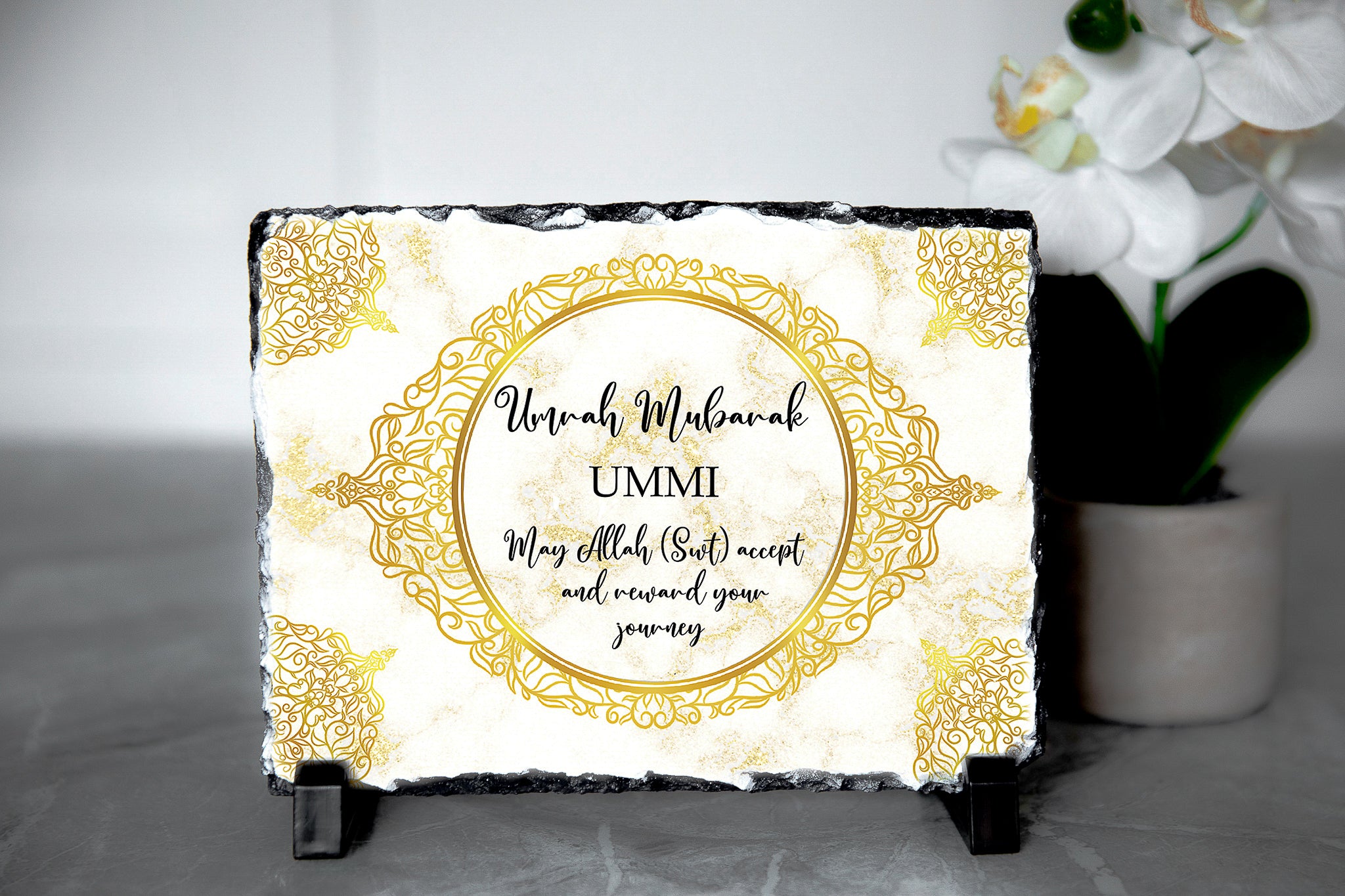 Personalised Umrah Mubarak or Hajj Rock Slate Gift with Gold marbleeffect