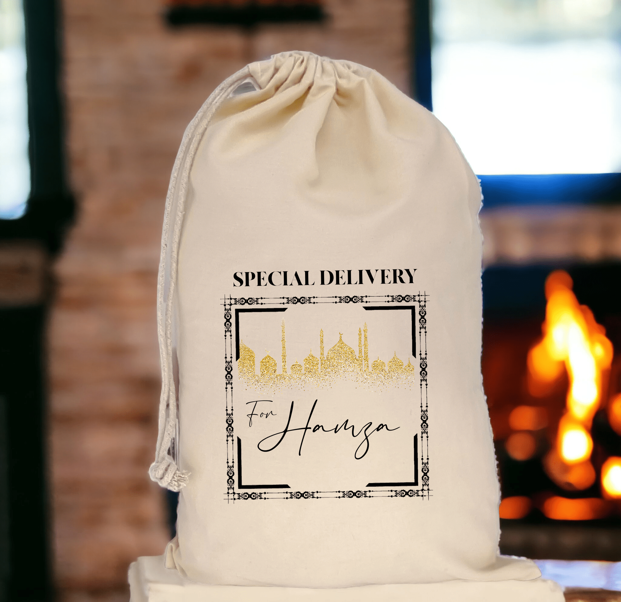 This is a Beautiful Special Delivery sack for Eid celebration with Recipients Name. This is special way to fill presents on Eid Day – and we've put together a range that will suit children and adults. These sacks are a great way to save on gift wrap. They can even be reused each year to bring even more festive joy. Our sacks are printed on, which means they will not fade or come off.